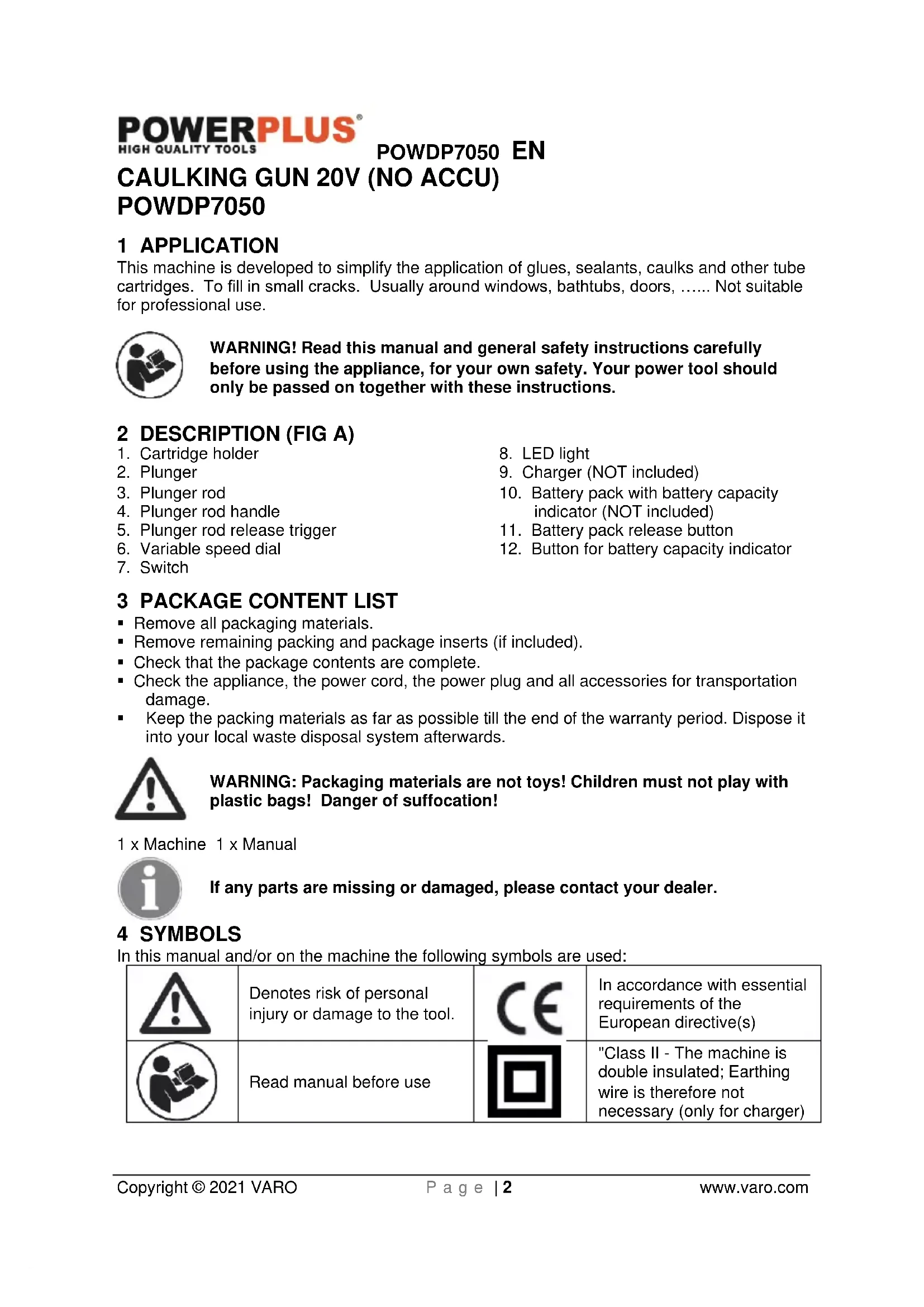VARO – Vic. Van Rompuy N.V. - Joseph Van Instraat 9 - BE2500 Lier - BELGIUM, declares that, Product: Caulking gun 20V Trade mark: PowerPlus Model: POWDP7050 is in conformity with the essential requirements and other relevant provisions of the applicable European Directives, based on the application of European harmonized standards. Any unauthorized modification of the apparatus voids this declaration. European Directives (including, if applicable, their amendments up to the date of signature); 2011/65/EU 2006/42/EC 2014/30/EU European harmonized standards (including, if applicable, their amendments up to the date of signature); EN62841-1 : 2015 EN ISO 12100 : 2010 EN55014-1 : 2017 EN55014-2 : 2015 Keeper of the Technical Documentation : Philippe Vankerkhove, VARO – Vic. Van Rompuy N.V. The undersigned acts on behalf of the company CEO, Ludo Mertens Regulatory Affairs – Compliance Manager 08/10/2020, Lier - BelgiumPOWDP7050 DE Copyright © 2021 VARO Seite | 1 www.varo.com 1 EINSATZBEREICH ......................................................................... 3