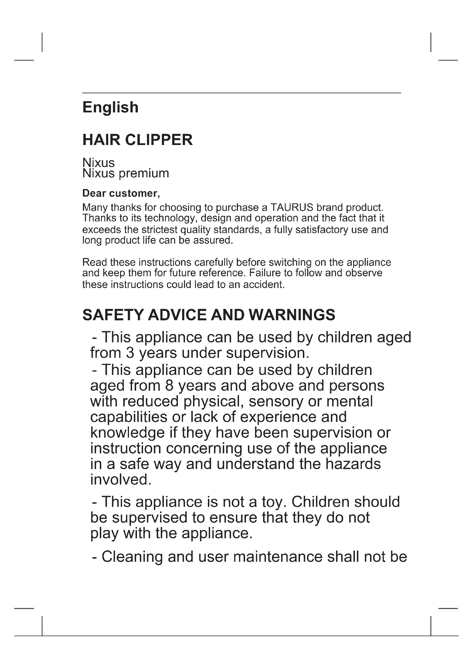 - This appliance can be used by children aged from 3 years under supervision. - This appliance can be used by children aged from 8 years and above and persons with reduced physical, sensory or mental capabilities or lack of experience and knowledge if they have been supervision or instruction concerning use of the appliance in a safe way and understand the hazards involved. - This appliance is not a toy. Children should be supervised to ensure that they do not play with the appliance. - Cleaning and user maintenance shall not bemade by children without supervision. - WARNING: Do not use this appliance near bathtubs, showers, basins or other vessels containing water. - This symbol means that product, must not be used near water. - This symbol means that product is not suitable for cleaning under an open water tap. - Only use the appliance with the specic electric connector provided. - Only use the appliance with the specic electric base / - Only connect the appliance to a safety extra low voltage corresponding to the marking on the appliance. - The battery must be removed from the appliance before it is scrapped. - The appliance must be disconnected from the supply mains when removing the battery. - The battery is to be disposed of safely. - If the connection to the mains has been damaged, it must be replaced, take the appliance to an authorised technical support service. Do not attempt to disassemble or repair the appliance by yourself in order to avoid a hazard.- This appliance is for household use only, not professional or industrial use. - For the pruposes of recharging the battery, only use the detachable supply unit provided with this appliance. - Instructions are also available on website www-taurus-home.com - Ensure that the voltage indicated on the charger rating label matches the mains voltage before plugging in the charger. - Connect the appliance to a socket that can supply a minimum of 10 amperes. - The charger’s plug must t correctly into the mains socket. Do not alter the plug. Do not use plug adaptors. - Do not force the power cord. Never use the power cord to lift up, carry or unplug the battery charger. - Do not wrap the power cord around the appliance. - Do not clip or crease the power cord. - Check the state of power cord. Damaged or tangled cables increase the risk of electric shock. - Supply cord should be regularly examined for signs of damage, and if the cord is damaged, the appliance must not be used. - Do not touch the plug with wet hands. - Do not use the appliance if the cable or plug is damaged. - If any of the appliance casings breaks, immediately disconnect the appliance from the mains to prevent the possibility of an electric shock. - Do not use the appliance if it has fallen on the oor, if there are visible signs or if it has a leak. - Avoid all contact with the liquid that could be released from the battery. In case of contact with eyes, wash them thoroughly and seek medical advice. The liquid spilled from the battery may accuse irritation or burns. - The appliance is not suitable for outdoor use. - Do not leave the appliance out in rain or exposed to moisture. If water gets into the appliance, this will increase the risk of electric shock. - CAUTION: Maintain the appliance dry. - Do not use the appliance with damp hands or feet, or when bare-footed. - Do not touch any of the appliance’s moving parts while it is oper- ating. USE AND CARE: - Do not use the appliance if its accessories are not properly tted. - Do not use the appliance on wet hair. - Do not use the appliance if on/off switch doesn’t works. - Disconnect the battery charger from the mains when not in use, and before undertaking any cleaning task. - Store this appliance out of reach of children and/or persons with physical, sensory or reduced mental or lack of experience and knowledge. - Never rest the appliance into a surface while in use. - Keep the appliance in good condition. Check that the moving parts are not misaligned or jammed and make sure there are no broken parts or anomalies that may prevent the appliance from operating correctly. - Do not use the appliance with pets or animals. - Do not open the battery/ies under any circumstances whatsoever. - Recharge the battery/ies only with the charger supplied by the manufacturer. A charger that is suitable for one typ of battery may cause explosion or re hazard when used with other battery/ies. - Use the device only with the battery/ies for which has been spe- cically designed. The use of any other battery/ies s can cause an explosion or re hazard. SERVICE: - The appliance has been oiled in origin, In order to maintain the appliance in good operation conditions we suggest greasing the blades every time you clean it by putting a few drops of oil on the ends of the blade, and nally switching on the appliance during a few seconds. - Make sure that the appliance is serviced only by specialist per- sonnel, and that only original spare parts or accessories are used to replace existing parts/accessories. - Any misuse or failure to follow the instructions for use renders the guarantee and the manufacturer’s liability null and avoid.DESCRIPTION A Blades A.1 Inner pivoting blade B Appliance body C On/off switch D Pilot light E Comb guide size (3-18) F Comb height selector G Blade release button H Cleanning brush I Lubricating oil J Scissors K Storage pouch (*) L Case (**) M Battery charger (*) Only available in the model NIXUS (**) Only available in the model NIXUS PREMIUM If the model of your appliance does not have the accessories de- scribed above, they can also be bought separately from the Technical Assistance Service. CHARGING THE BATTERY: - Caution: a new battery is not fully charged and must therefore be charged before the appliance is used for the rst time. - Charge the battery at an atmospheric temperature of between 4 and 40ºC. - Connect the charger to the jack using the socket on the appliance. The socket is located at the lower/