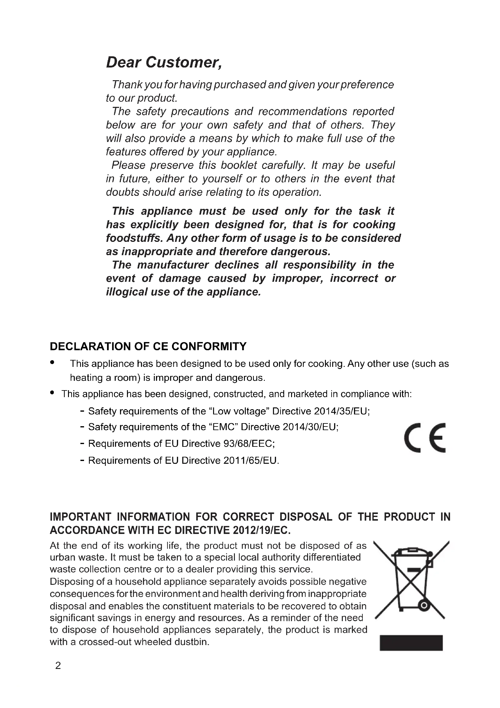 CANDY HOOVER GROUP S.R.L. • Via Comolli 16 • 20861 Brugherio (MB) Italy22 Dear Customer, Thank you for having purchased and given your preference to our product. The safety precautions and recommendations reported below are for your own safety and that of others. They will also provide a means by which to make full use of the features oered by your appliance. Please preserve this booklet carefully. It may be useful in future, either to yourself or to others in the event that doubts should arise relating to its operation. This appliance must be used only for the task it has explicitly been designed for, that is for cooking foodstus. Any other form of usage is to be considered as inappropriate and therefore dangerous. The manufacturer declines all responsibility in the event of damage caused by improper, incorrect or illogical use of the appliance. IMPORTANT INFORMATION FOR CORRECT DISPOSAL OF THE PRODUCT IN ACCORDANCE WITH EC DIRECTIVE 2012/19/EC. At the end of its working life, the product must not be disposed of as urban waste. It must be taken to a special local authority dierentiated waste collection centre or to a dealer providing this service. Disposing of a household appliance separately avoids possible negative consequences for the environment and health deriving from inappropriate disposal and enables the constituent materials to be recovered to obtain signicant savings in energy and resources. As a reminder of the need to dispose of household appliances separately, the product is marked with a crossed-out wheeled dustbin.