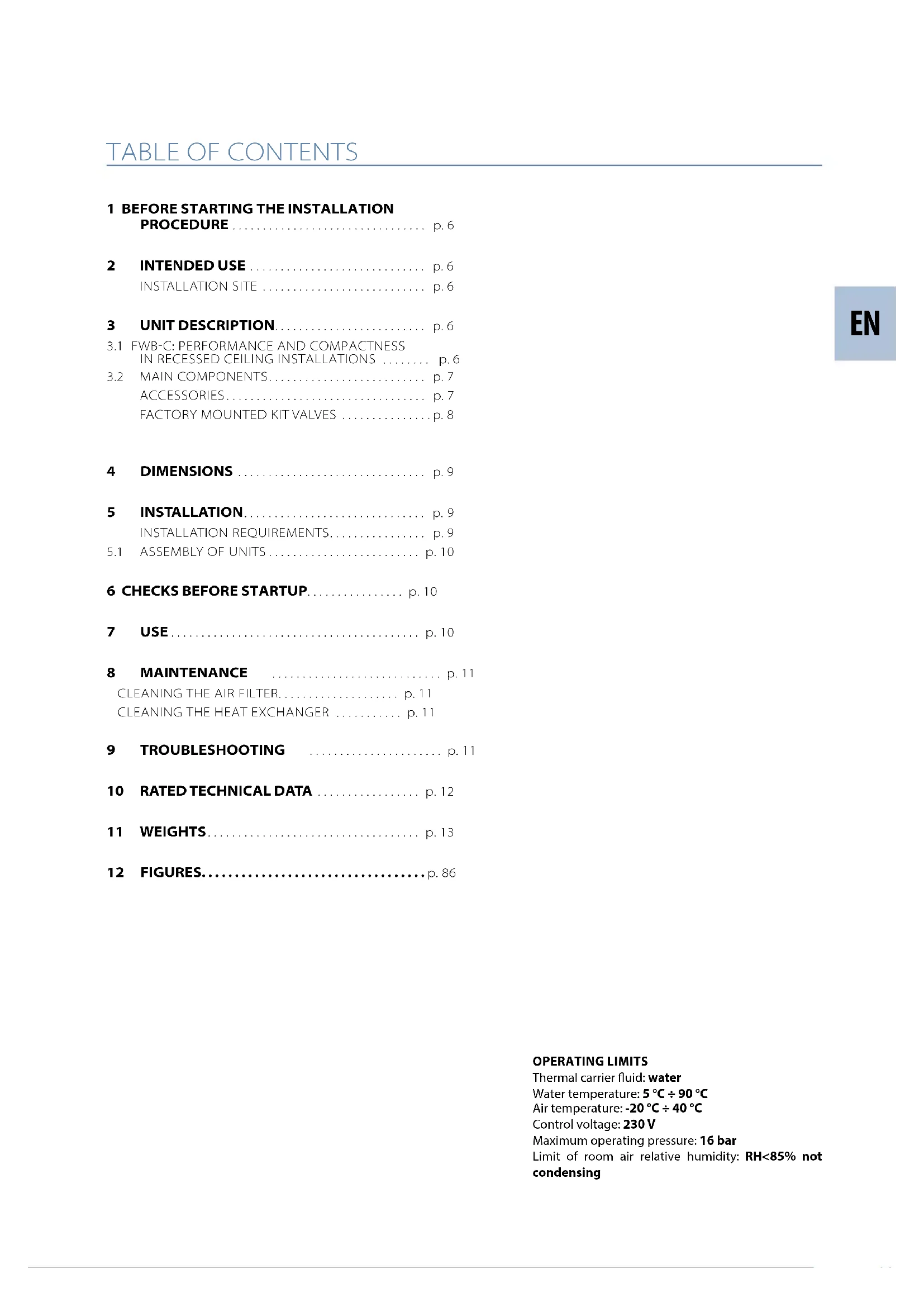 Water content - additional coil dm³ 0,97 0,97 0,97 0,97 Power supply cable type N07V-K N07V-K N07V-K N07V-K Cross-section area of power cables (5) mm² 1,50 1,50 1,50 1,50 Safety fuse F A 2 2 2 2 Fuses type gG gG gG gG (1) Water temperature 7°C / 12°C, air temperature dry bulb 27°C, wet bulb 19°C (47% relative humidity) according to EN1397:2021 (2) Water temperature 7°C / 12°C, air temperature dry bulb 27°C, wet bulb 19°C (47% relative humidity) (3) Water temperature 65°C / 55°C, air temperature 20°C(4) Sound power measured according to standards ISO 3741 and ISO 3742 (5) The shown section is to be considered as the minimum recommended section. The cables must be chosen in compliance with CEI - UNEL 35024/1. standard. (E) EUROVENT certified dataPower supply 230-1-50 (V-ph-Hz) 11 WEIGHTS FWB-C