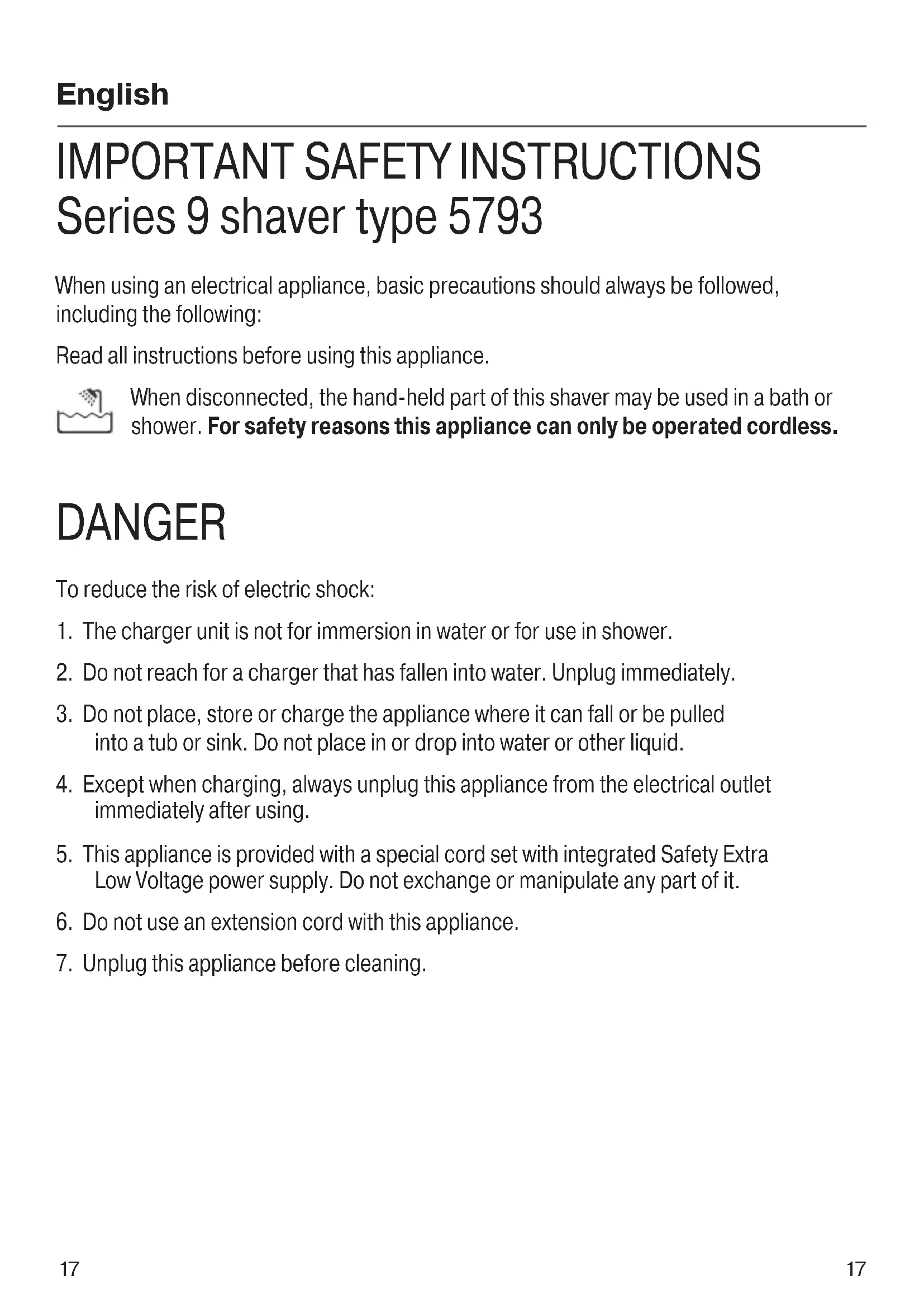Series 9 shaver type 5793 When using an electrical appliance, basic precautions should always be followed, including the following: Read all instructions before using this appliance. When disconnected, the hand-held part of this shaver may be used in a bath or shower. For safety reasons this appliance can only be operated cordless. DANGER To reduce the risk of electric shock: