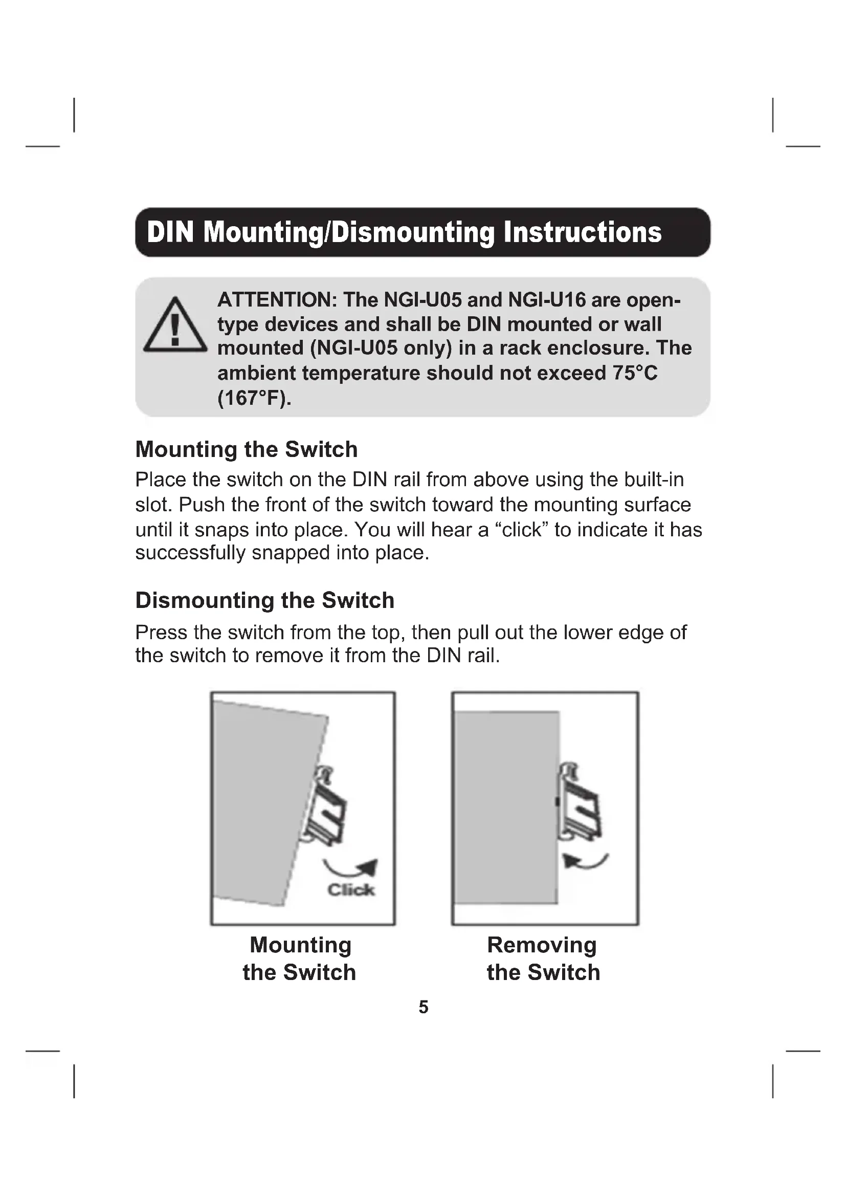 - N001-Series Cat5e 350 MHz Snagless UTP Cables Product Overview Top View Front View 10/100 1000 Mbps Grounding Screw Power4 Product Overview NGI-U16 Top View Front View Grounding Screw DIN Rail Grounding Screw LNK/ACT PWR 1000 Mbps Power Input Terminal Block5 ATTENTION: The NGI-U05 and NGI-U16 are open- type devices and shall be DIN mounted or wall mounted (NGI-U05 only) in a rack enclosure. The ambient temperature should not exceed 75°C (167°F). Mounting the Switch Place the switch on the DIN rail from above using the built-in slot. Push the front of the switch toward the mounting surface until it snaps into place. You will hear a “click” to indicate it has successfully snapped into place. Dismounting the Switch Press the switch from the top, then pull out the lower edge of the switch to remove it from the DIN rail. DIN Mounting/Dismounting Instructions Mounting the Switch Removing the Switch6 DIN Mounting/Dismounting Instructions Wall-Mounted Mask (NGI-U05 Only)