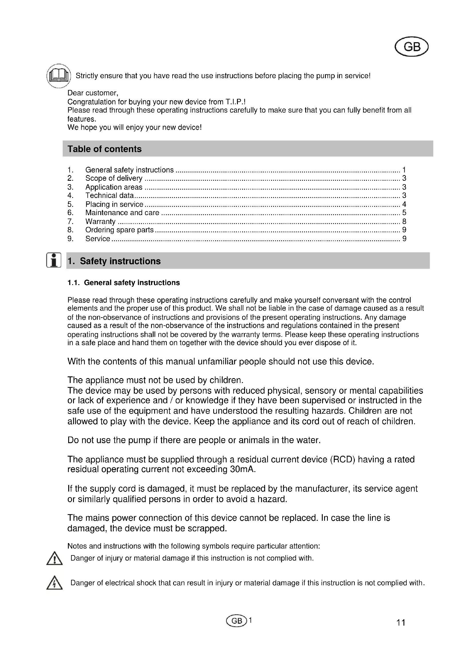 1.1. General safety instructions Please read through these operating instructions carefully and make yourself conversant with the control elements and the proper use of this product. We shall not be liable in the case of damage caused as a result of the non-observance of instructions and provisions of the present operating instructions. Any damage caused as a result of the non-observance of the instructions and regulations contained in the present operating instructions shall not be covered by the warranty terms. Please keep these operating instructions in a safe place and hand them on together with the device should you ever dispose of it. With the contents of this manual unfamiliar people should not use this device. The appliance must not be used by children. The device may be used by persons with reduced physical, sensory or mental capabilities or lack of experience and / or knowledge if they have been supervised or instructed in the safe use of the equipment and have understood the resulting hazards. Children are not allowed to play with the device. Keep the appliance and its cord out of reach of children. Do not use the pump if there are people or animals in the water. The appliance must be supplied through a residual current device (RCD) having a rated residual operating current not exceeding 30mA. If the supply cord is damaged, it must be replaced by the manufacturer, its service agent or similarly qualified persons in order to avoid a hazard. The mains power connection of this device cannot be replaced. In case the line is damaged, the device must be scrapped. Notes and instructions with the following symbols require particular attention:
