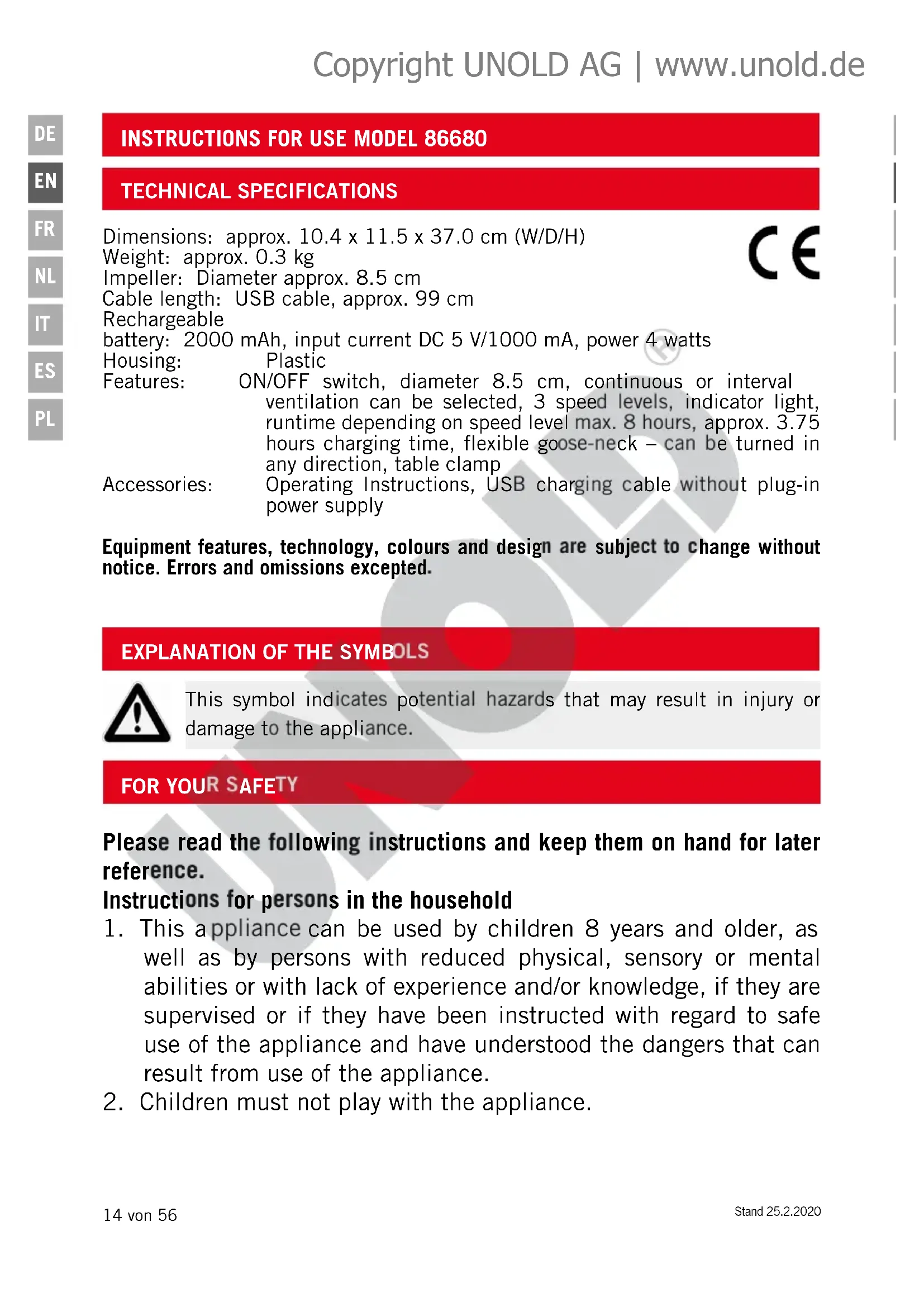 Dimensions: approx. 10.4 x 11.5 x 37.0 cm (W/D/H) Weight: approx. 0.3 kg Impeller: Diameter approx. 8.5 cm Cable length: USB cable, approx. 99 cm Rechargeable battery: 2000 mAh, input current DC 5 V/1000 mA, power 4 watts Housing: Plastic Features: ON/OFF switch, diameter 8.5 cm, continuous or interval ventilation can be selected, 3 speed levels, indicator light, runtime depending on speed level max. 8 hours, approx. 3.75 hours charging time, flexible goose-neck – can be turned in any direction, table clamp Accessories: Operating Instructions, USB charging cable without plug-in power supply Equipment features, technology, colours and design are subject to change without notice. Errors and omissions excepted. Copyright UNOLD AG | www.unold.deStand 25.2.2020 15 von 56
