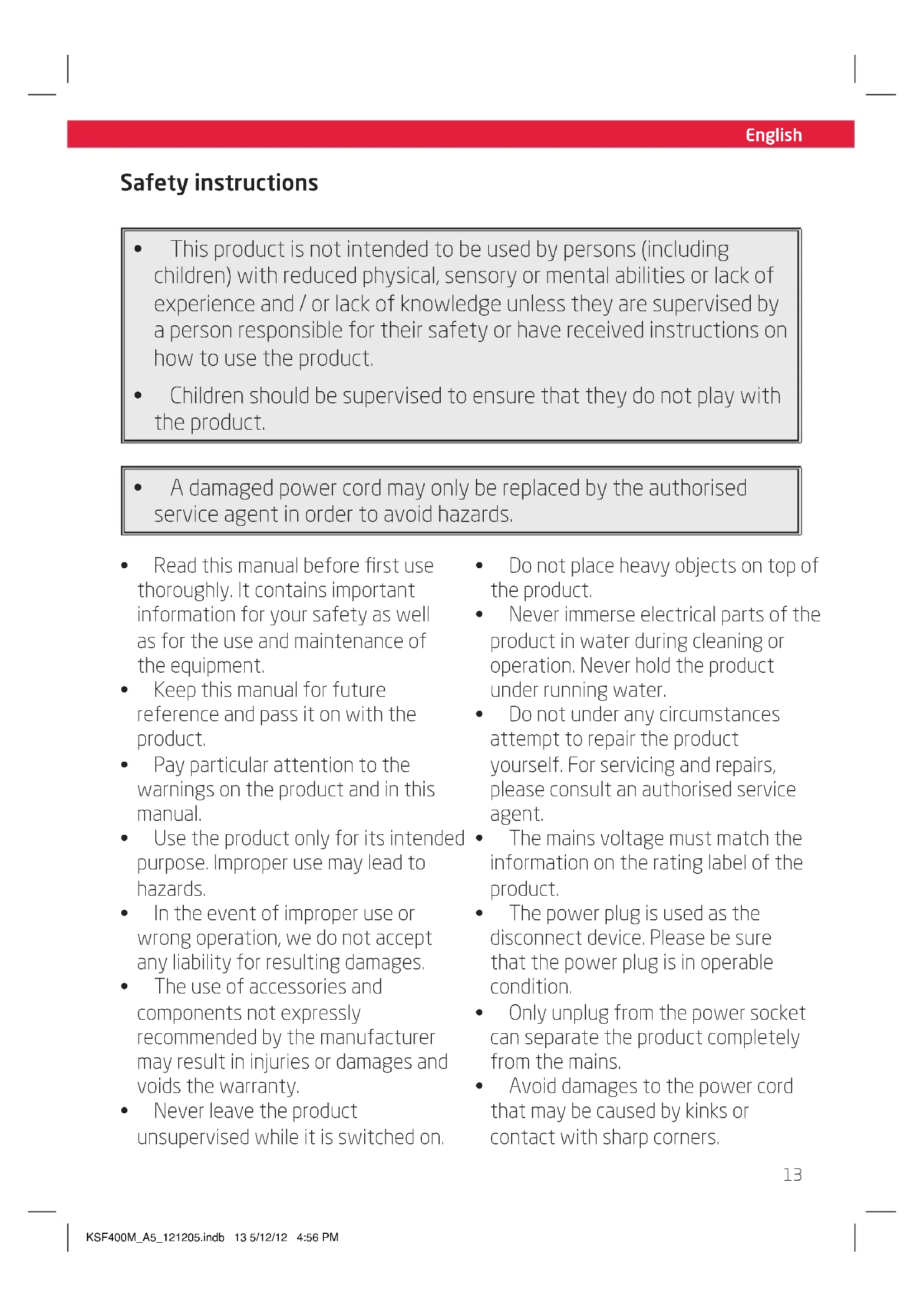 - Avoid damages to the power cord that may be caused by kinks or contact with sharp corners. KSF400M_A5_121205.indb 13 5/12/12 4:56 PMEnglish