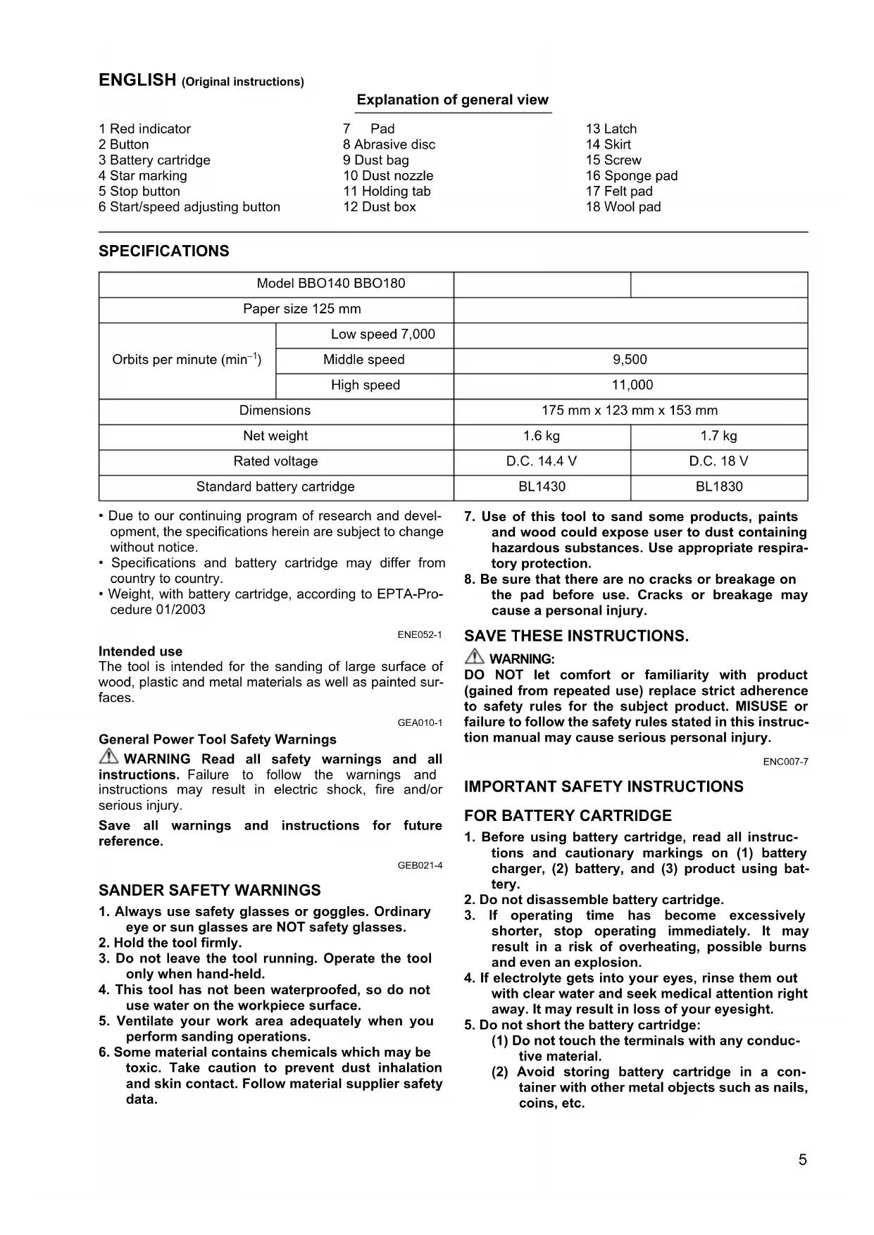 (1) Do not touch the terminals with any conduc- tive material. (2) Avoid storing battery cartridge in a con- tainer with other metal objects such as nails, coins, etc. Model BBO140 BBO180 Paper size 125 mm Orbits per minute (min