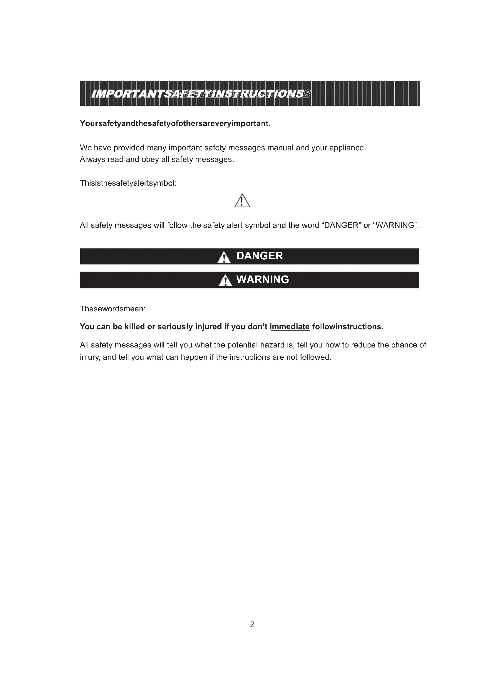 TROUBLESHOOTINGTROUBLESHOOTING………………………………………………………… .…………………………………………….........................................10 is a pending or registered trademark used under license from Electrolux Home Products, Inc.Made In China2 DANGER WARNING Your safety and the safety of others are very important. We have provided many important safety messages manual and your appliance. Always read and obey all safety messages. This is the safety alert symbol: