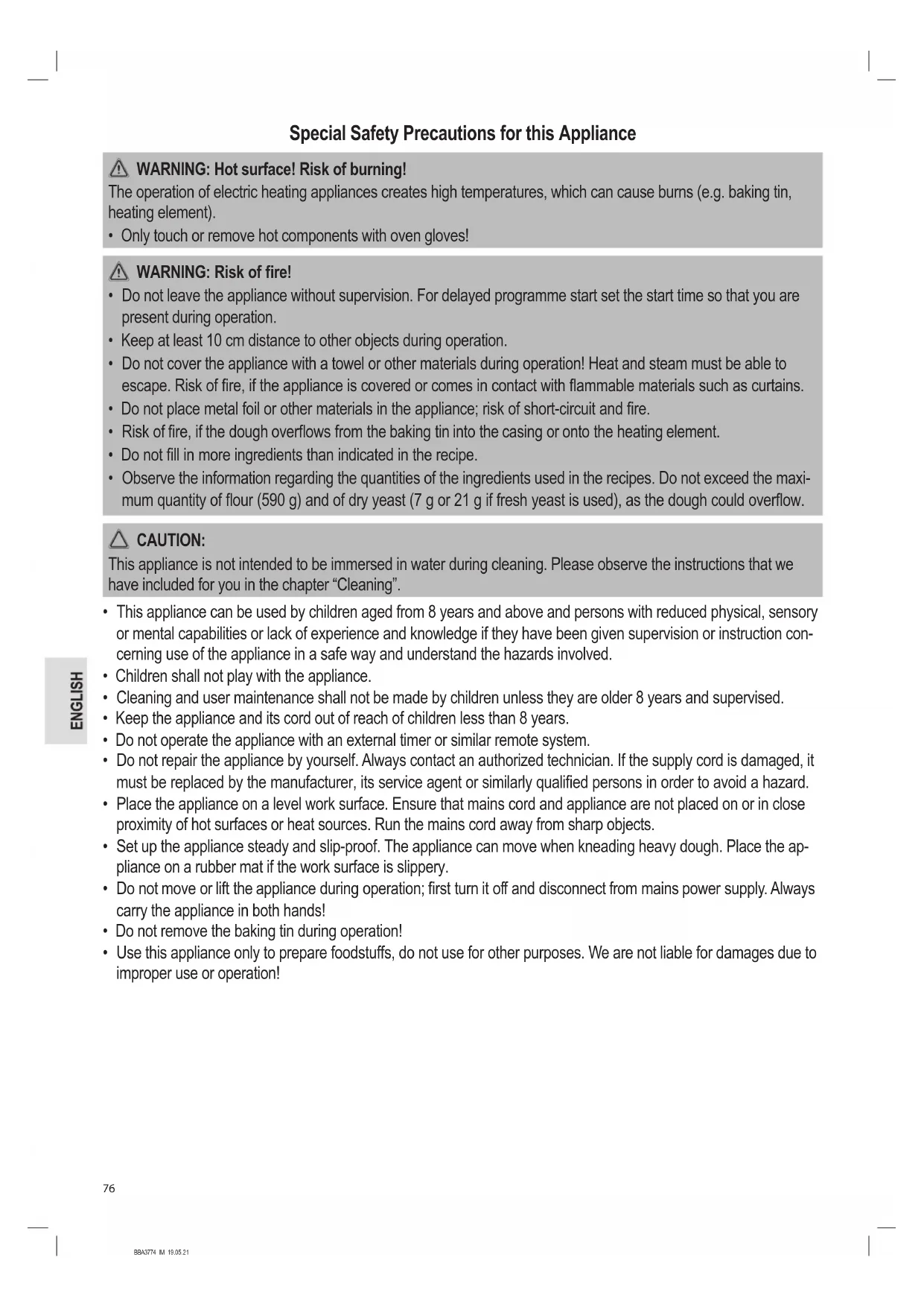 - Observe the information regarding the quantities of the ingredients used in the recipes. Do not exceed the maxi- mum quantity of our (590 g) and of dry yeast (7 g or 21 g if fresh yeast is used), as the dough could overow. CAUTION: This appliance is not intended to be immersed in water during cleaning. Please observe the instructions that we have included for you in the chapter “Cleaning”.