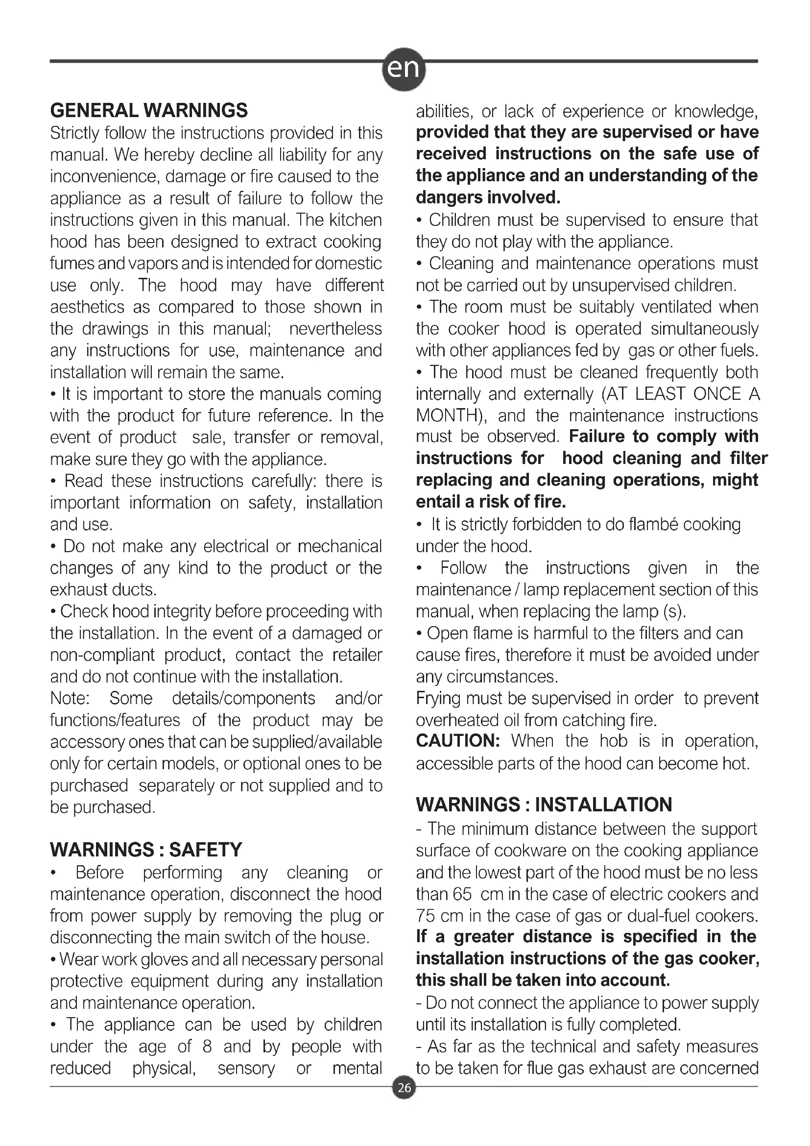 The hood must be cleaned frequently both internally and externally (AT LEAST ONCE A MONTH), and the maintenance instructions must be observed. Failure to comply with instructions for hood cleaning and filter replacing and cleaning operations, might entail a risk of fire.