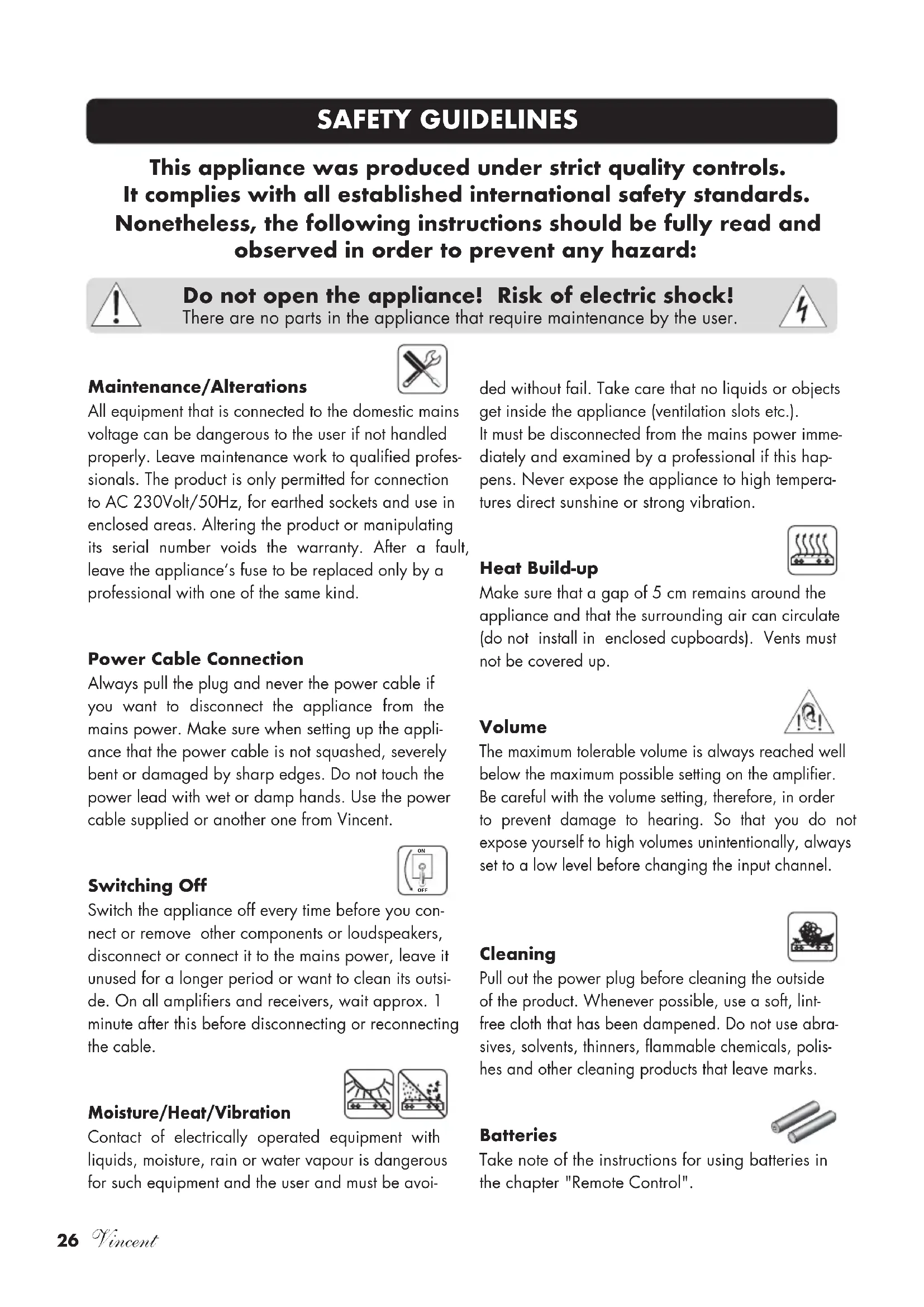 Setting up the appliance How the system is set up has an effect on the sound quality. Therefore only place it on a suitab- le, stable surface. To make the most of your system’s sound quality, we recommend placing the equipment on Vincent racks and not putting them on top of each other. Old electronic equipment This appliance is subject to the conditions set out in the European Directive 2012/19/EU. This is identified by the symbol of a crossed out waste bin on the appliance. What this means for you as a consumer: All old electrical and electronic equipment that is no longer used must be disposed of separately from domestic waste using places provided by the authorities. By doing so you can prevent damage to the environment and help to encourage manu- facturers to produce more durable or reusable pro- ducts. For further information about disposing your old appliance, please consult your local aut- hority, waste disposal agency or the shop where you bought the product. CE sign This appliance complies with the current EU direc- tives about attaining the CE mark and thus meets the requirements for electrical and electronic equipment (EMC regulations, regulations and re - gulations for low voltage equipment). Automatic shutdown function If the unit is in non-use, this device switches off after about 45 minutes. It will then have a power consumption of less than 0.4 W. In order to switch on the device again, press the power button 1 time. This device has got no standby or armed state. If you intend not to use the device for a lon- ger period of time it is recommended to plug it off from the mains. Declarations This document is a product of Sintron Distribution GmbH, 76473 Iffezheim and may not be copied or distributed partly or in full without express, written consent. Vincent is a registered trademark of Sintron Distribution GmbH, 76473 Iffezheim. Vincent works continually to improve and develop its products. Therefore, the appearance and technical design of the appliance are subject to changes, as long as they are in the interest of progress. The content of these instructions is for information purposes only. It can be changed at any time without prior notice and does not constitute any obligation on the part of the trademark’s owner. The latter assu- mes no responsibility or liability for errors or inaccu- racies, which may be included in these operating instructions. Storage of the packaging We strongly recommend that you keep the original packaging in case you need to transport the equip- ment again at a later date. Transport damages are mainly caused by improper packaging of the HiFi- devices. Because the original packaging fits the equipment accurately it will reduce the risk of damage if transport is necessary. Explanation of the symbols The lightening bolt tells you that dangerous voltages are present in the appliance, which can cause an electric shock. This symbol brings your attention to particularly important information regarding operation and maintenance. This symbol identifies useful information and advice about how to handle the appliance. OTHER INSTRUCTIONS28 Vincent