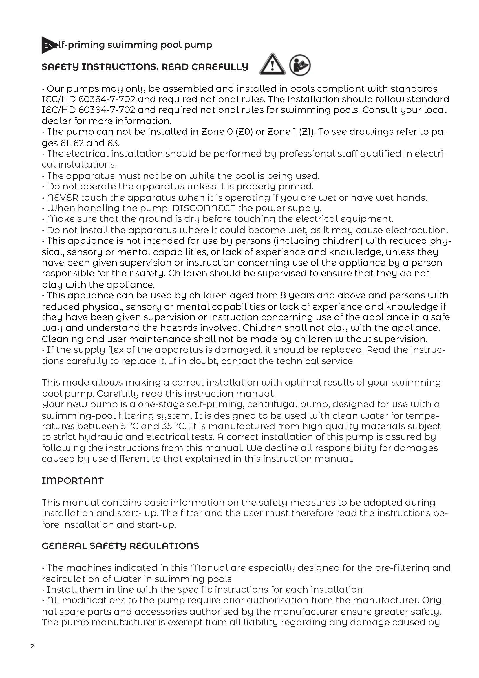 - If the supply flex of the apparatus is damaged, it should be replaced. Read the instruc- tions carefully to replace it. If in doubt, contact the technical service. This mode allows making a correct installation with optimal results of your swimming pool pump. Carefully read this instruction manual. Your new pump is a one-stage self-priming, centrifugal pump, designed for use with a swimming-pool filtering system. It is designed to be used with clean water for tempe- ratures between 5 ºC and 35 ºC. It is manufactured from high quality materials subject to strict hydraulic and electrical tests. A correct installation of this pump is assured by following the instructions from this manual. We decline all responsibility for damages caused by use different to that explained in this instruction manual. IMPORTANT This manual contains basic information on the safety measures to be adopted during installation and start- up. The fitter and the user must therefore read the instructions be- fore installation and start-up.