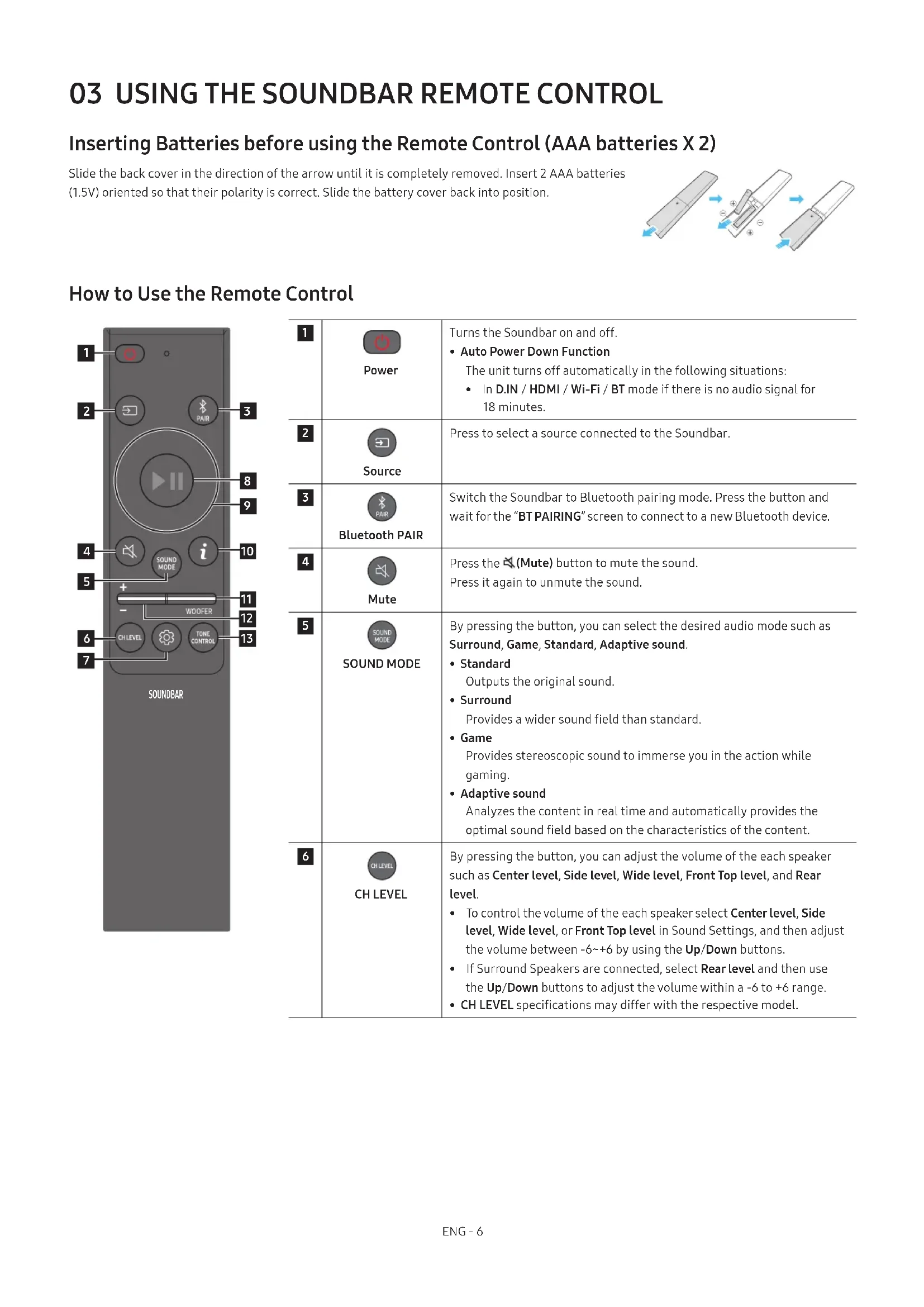 Inserting Batteries before using the Remote Control (AAA batteries X 2) Slide the back cover in the direction of the arrow until it is completely removed. Insert 2 AAA batteries (1.5V) oriented so that their polarity is correct. Slide the battery cover back into position. How to Use the Remote Control SOUNDBAR