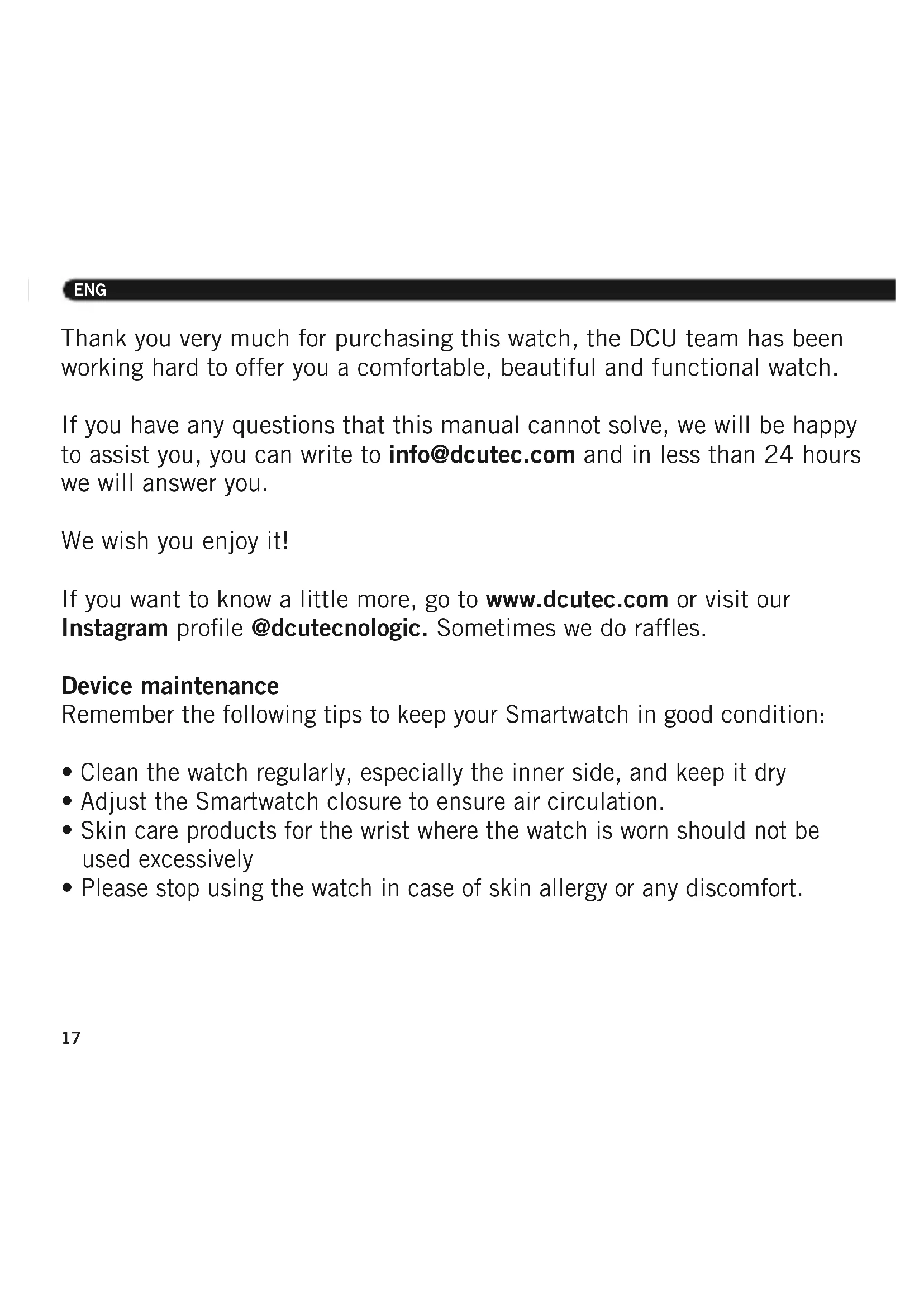 servicio de atención al cliente o con la tienda donde lo compró.17 ENG Thank you very much for purchasing this watch, the DCU team has been working hard to offer you a comfortable, beautiful and functional watch. If you have any questions that this manual cannot solve, we will be happy to assist you, you can write to info@dcutec.com and in less than 24 hours we will answer you. We wish you enjoy it! If you want to know a little more, go to www.dcutec.com or visit our Instagram profile @dcutecnologic. Sometimes we do raffles. Device maintenance Remember the following tips to keep your Smartwatch in good condition: