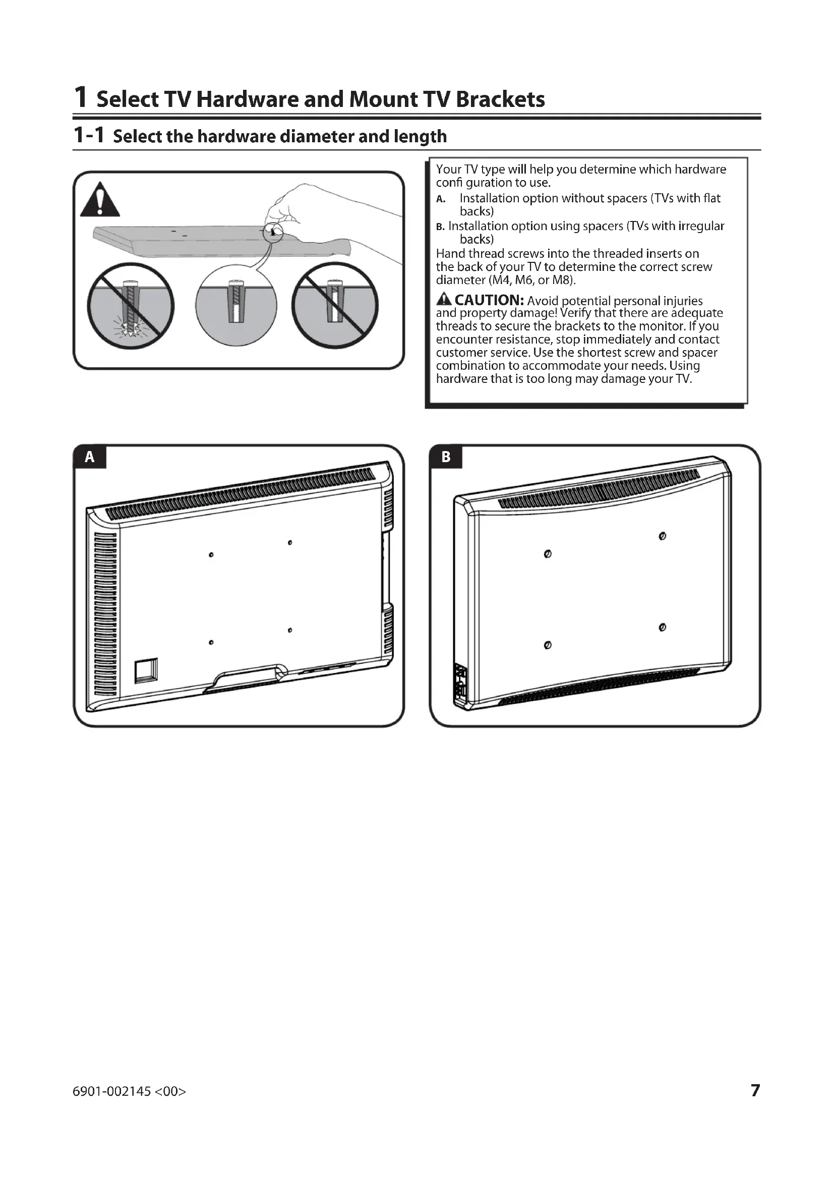 Your TV type will help you determine which hardware con guration to use. A. Installation option without spacers (TVs with at backs)B. Installation option using spacers (TVs with irregular backs)Hand thread screws into the threaded inserts on the back of your TV to determine the correct screw diameter (M4, M6, or M8). CAUTION: Avoid potential personal injuries and property damage! Verify that there are adequate threads to secure the brackets to the monitor. If you encounter resistance, stop immediately and contact customer service. Use the shortest screw and spacer combination to accommodate your needs. Using hardware that is too long may damage your TV.
