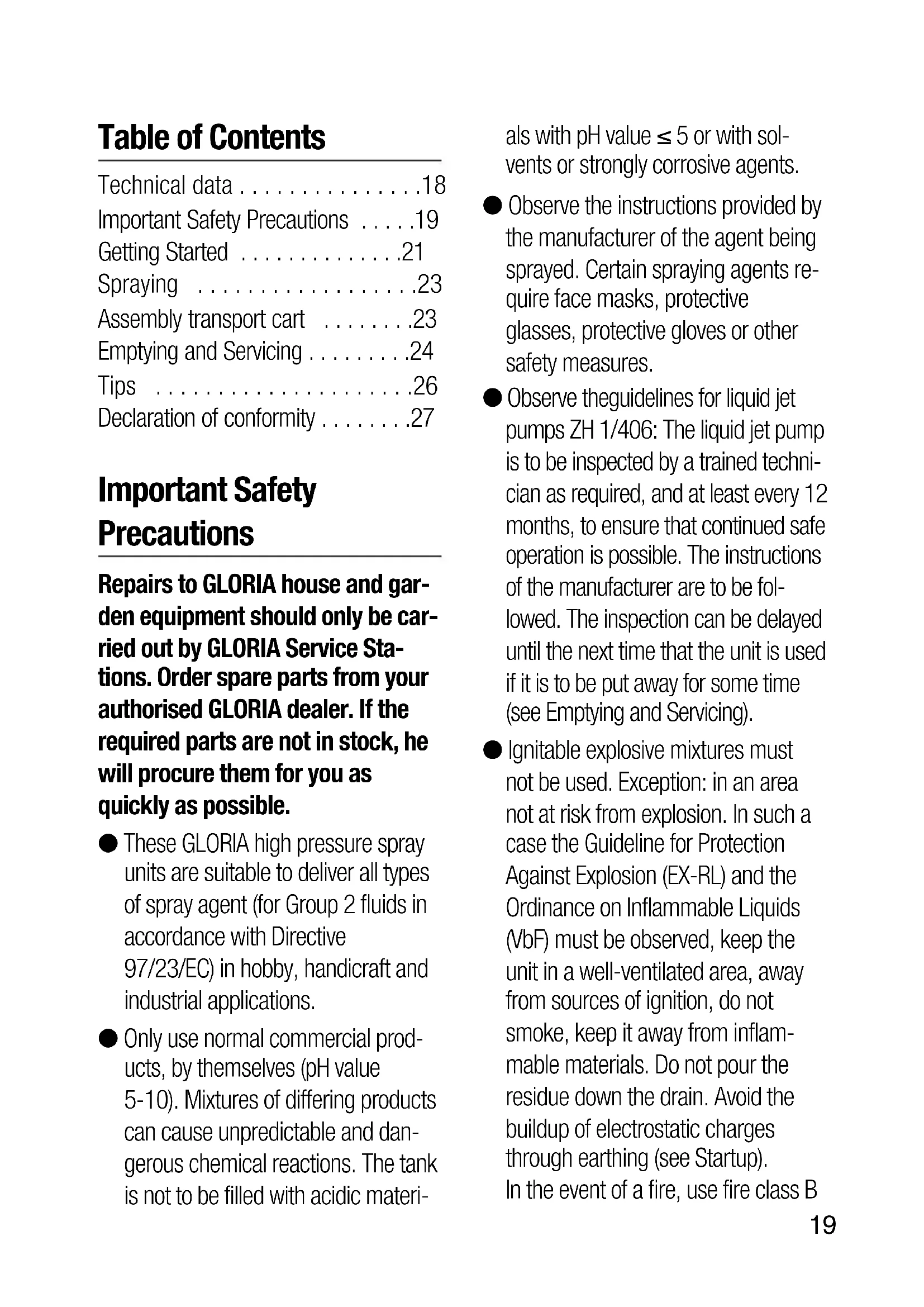 - Declaration of conformity Important Safety Precautions Repairs to GLORIA house and gar- den equipment should only be car- ried out by GLORIA Service Sta- tions. Order spare parts from your authorised GLORIA dealer. If the required parts are not in stock, he will procure them for you as quickly as possible. l These GLORIA high pressure spray units are suitable to deliver all types of spray agent (for Group 2 fluids in accordance with Directive 97/23/EC) in hobby, handicraft and industrial applications. l Only use normal commercial prod- ucts, by themselves (pH value 5-10). Mixtures of differing products can cause unpredictable and dan- gerous chemical reactions. The tank is not to be filled with acidic materi- als with pH value ≤ 5 or with sol- vents or strongly corrosive agents. l Observe the instructions provided by the manufacturer of the agent being sprayed. Certain spraying agents re- quire face masks, protective glasses, protective gloves or other safety measures. l Observe theguidelines for liquid jet pumps ZH 1/406: The liquid jet pump is to be inspected by a trained techni- cian as required, and at least every 12 months, to ensure that continued safe operation is possible. The instructions of the manufacturer are to be fol- lowed. The inspection can be delayed until the next time that the unit is used if it is to be put away for some time (see Emptying and Servicing). l Ignitable explosive mixtures must not be used. Exception: in an area not at risk from explosion. In such a case the Guideline for Protection Against Explosion (EX-RL) and the Ordinance on Inflammable Liquids (VbF) must be observed, keep the unit in a well-ventilated area, away from sources of ignition, do not smoke, keep it away from inflam- mable materials. Do not pour the residue down the drain. Avoid the buildup of electrostatic charges through earthing (see Startup). In the event of a fire, use fire class B20 extinguishing agents (powder, foam, p. 27