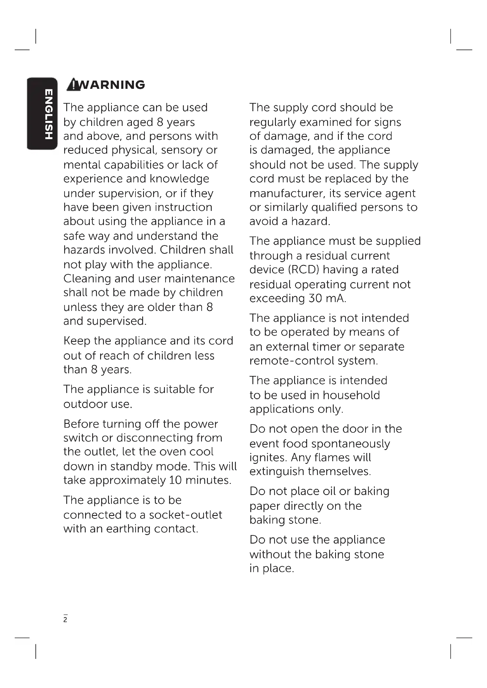 - SV ENGLISH WARNING The appliance can be used by children aged 8 years and above, and persons with reduced physical, sensory or mental capabilities or lack of experience and knowledge under supervision, or if they have been given instruction about using the appliance in a safe way and understand the hazards involved. Children shall not play with the appliance. Cleaning and user maintenance shall not be made by children unless they are older than 8 and supervised. Keep the appliance and its cord out of reach of children less than 8 years. The appliance is suitable for outdoor use. Before turning o the power switch or disconnecting from the outlet, let the oven cool down in standby mode. This will take approximately 10 minutes. The appliance is to be connected to a socket-outlet with an earthing contact. The supply cord should be regularly examined for signs of damage, and if the cord is damaged, the appliance should not be used. The supply cord must be replaced by the manufacturer, its service agent or similarly qualified persons to avoid a hazard. The appliance must be supplied through a residual current device (RCD) having a rated residual operating current not exceeding 30 mA. The appliance is not intended to be operated by means of an external timer or separate remote-control system. The appliance is intended to be used in household applications only. Do not open the door in the event food spontaneously ignites. Any flames will extinguish themselves. Do not place oil or baking paper directly on the baking stone. Do not use the appliance without the baking stone in place.3 ENGLISH Do not rest anything on the door once open. Avoid cold items of food dropping onto the inside of the door. Do not use oven cleaners and metal scourers to clean this appliance. Do not use a hose or pressure washer to clean this appliance Only store the baking stone inside the oven. Do not lean or set items on top of the oven. This appliance is intended for use up to a maximum of 3,000 meters above sea level. This appliance generates heat during use. Do not touch hot surfaces. Use handles or knobs. Always protect your hands with non-slip oven mitts or similar.4 ENGLISH p. 1622