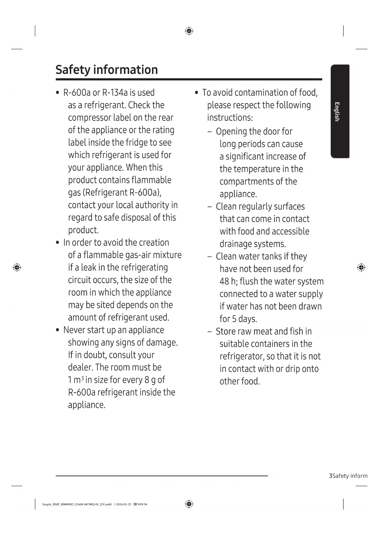 - To avoid contamination of food, please respect the following instructions: – Opening the door for long periods can cause a significant increase of the temperature in the compartments of the appliance. – Clean regularly surfaces that can come in contact with food and accessible drainage systems. – Clean water tanks if they have not been used for 48 h; flush the water system connected to a water supply if water has not been drawn for 5 days. – Store raw meat and fish in suitable containers in the refrigerator, so that it is not in contact with or drip onto other food. Simple_BMF_RB6000D_DA68-04780Q-01_EN.indd 3 2024-01-25 9:09:56Safety information4 English – Two-star frozen-food compartments are suitable for storing pre-frozen food, storing or making icecream and making ice cubes. – One-, two- and three-star compartments are not suitable for the freezing of fresh food. – If the refrigerating appliance is left empty for long periods, switch off, defrost, clean, dry, and leave the door open to prevent mould developing within the appliance. Important safety precautions WARNING; Risk of fire / flammable materials WARNING