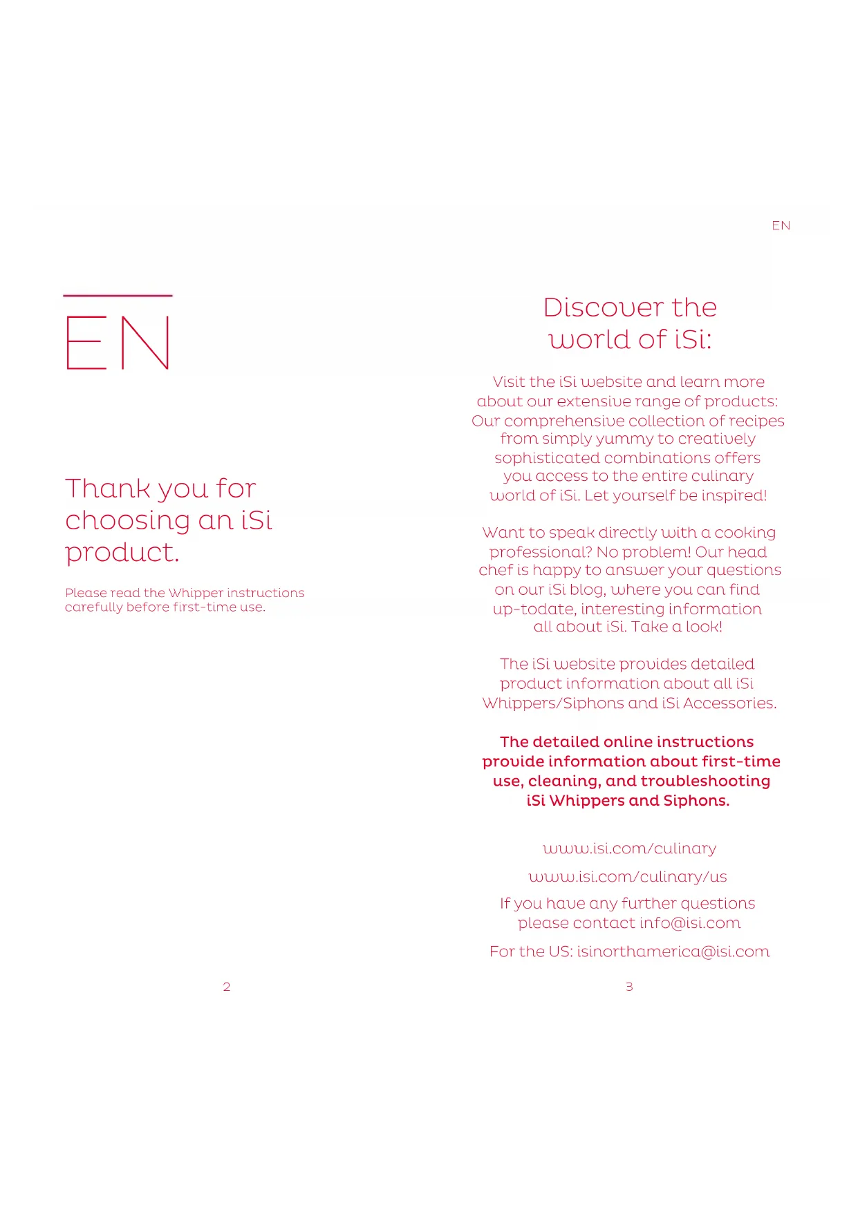 Thank you for choosing an iSi product. Please read the Whipper instructions carefully before first-time use.4 5