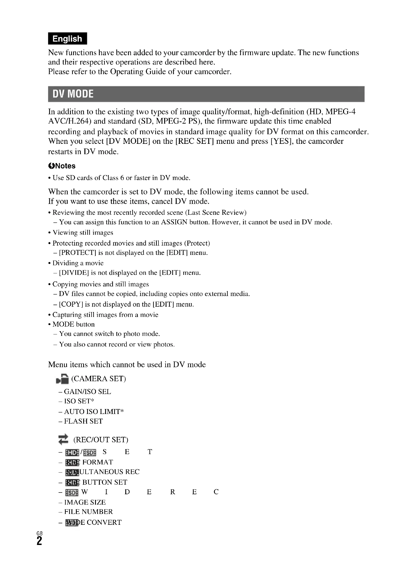 New functions have been added to your camcorder by the firmware update. The new functions and their respective operations are described here. Please refer to the Operating Guide of your camcorder. In addition to the existing two types of image quality/format, high-definition (HD, MPEG-4 AVC/H.264) and standard (SD, MPEG-2 PS), the firmware update this time enabled recording and playback of movies in standard image quality for DV format on this camcorder. When you select [DV MODE] on the [REC SET] menu and press [YES], the camcorder restarts in DV mode. b Notes