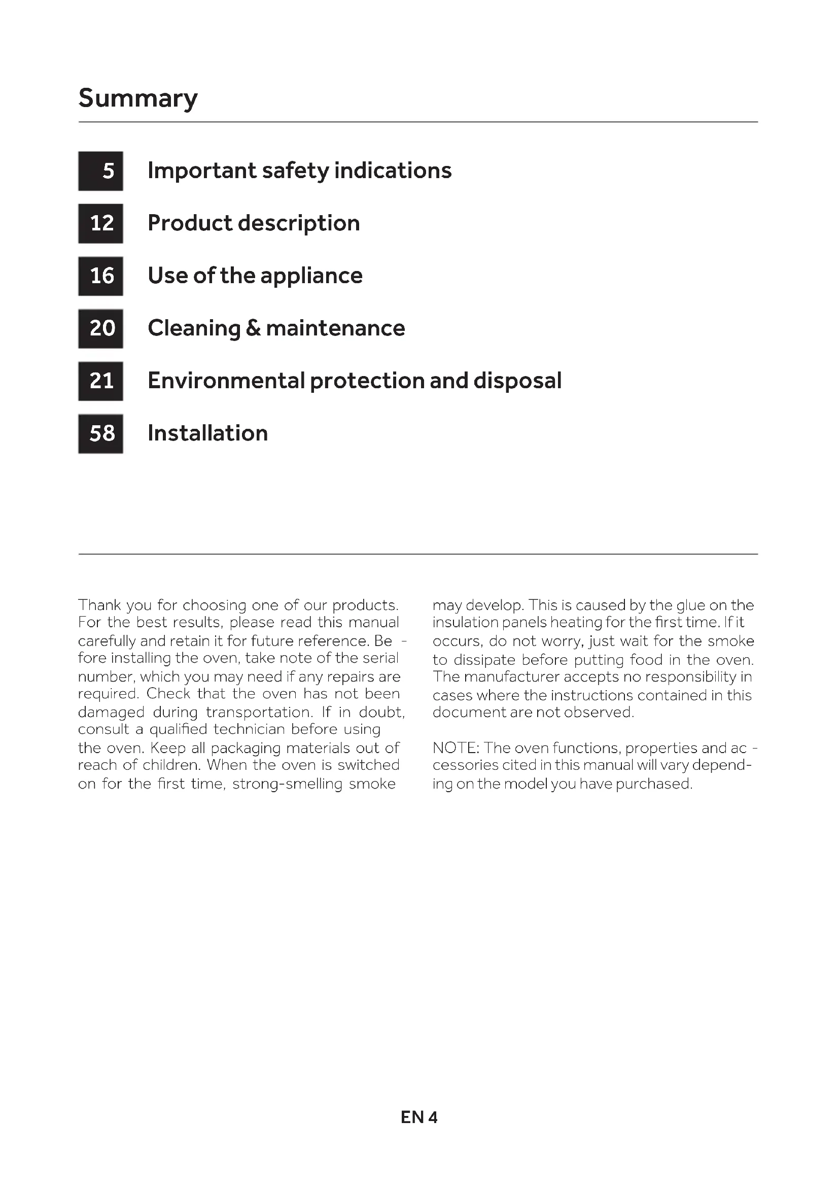 fore installing the oven, take note of the serial number, which you may need if any repairs are required. Check that the oven has not been damaged during transportation. If in doubt, consult a qualied technician before using the oven. Keep all packaging materials out of reach of children. When the oven is switched on for the rst time, strong-smelling smoke may develop. This is caused by the glue on the insulation panels heating for the rst time. If it occurs, do not worry, just wait for the smoke to dissipate before putting food in the oven. The manufacturer accepts no responsibility in cases where the instructions contained in this document are not observed. NOTE: The oven functions, properties and ac