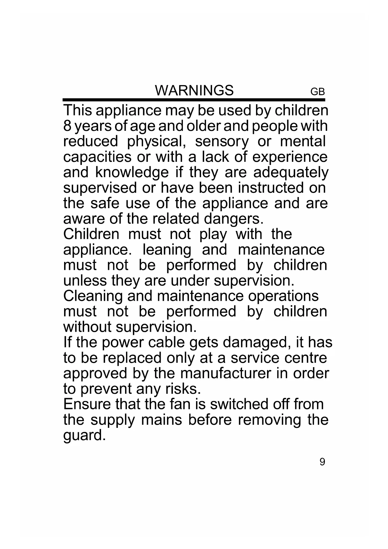 A-B. Locking pin for the rear grille13 Before carrying out the regular cleaning operations turn o the fan and unplug it. Ensure that the fan is switched o from the supply mains before removing the guard. For external cleaning use a soft and dry cloth. DO NOT dip the device in water, or splash it with any other liquids. DO NOT use solvents or any other chemical products for cleaning it. Reinstall the guard after cleaning and before connecting the plug tot he mains. When you do not use it, after cleaning it, store the fan in a dry place. MAINTENANCE Place the fan on a at, dry and stable surface, and insert the plug of the fan in a socket. Select the desired speed by pressing the buttons on the control panel (10): 0 = o 1 = minimum speed 2 = medium speed 3 = maximum speed OSCILLATION: For the automatic oscillation from right to left press the knob (8) placed on top of the motor. To disable it, pull up the knob. VERTICAL SLOPE: You can vertically point the front of the fan choosing the desired angle. It is sucient to move the front of the fan up or down according to the desired slope. ADJUSTMENT HEIGHT Loosen the height adjustment knob (13), then set the desired height for the fan. Tighten rmly the knob after adjusting the rod. N.B: this operation must always be carried out while the fan is turned o.