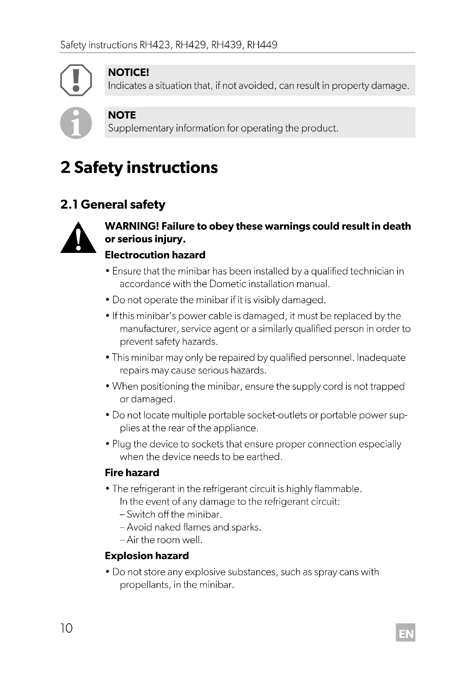 - Do not store any explosive substances, such as spray cans with propellants, in the minibar. NOTICE! Indicates a situation that, if not avoided, can result in property damage. NOTE Supplementary information for operating the product.EN RH423, RH429, RH439, RH449 Safety instructions