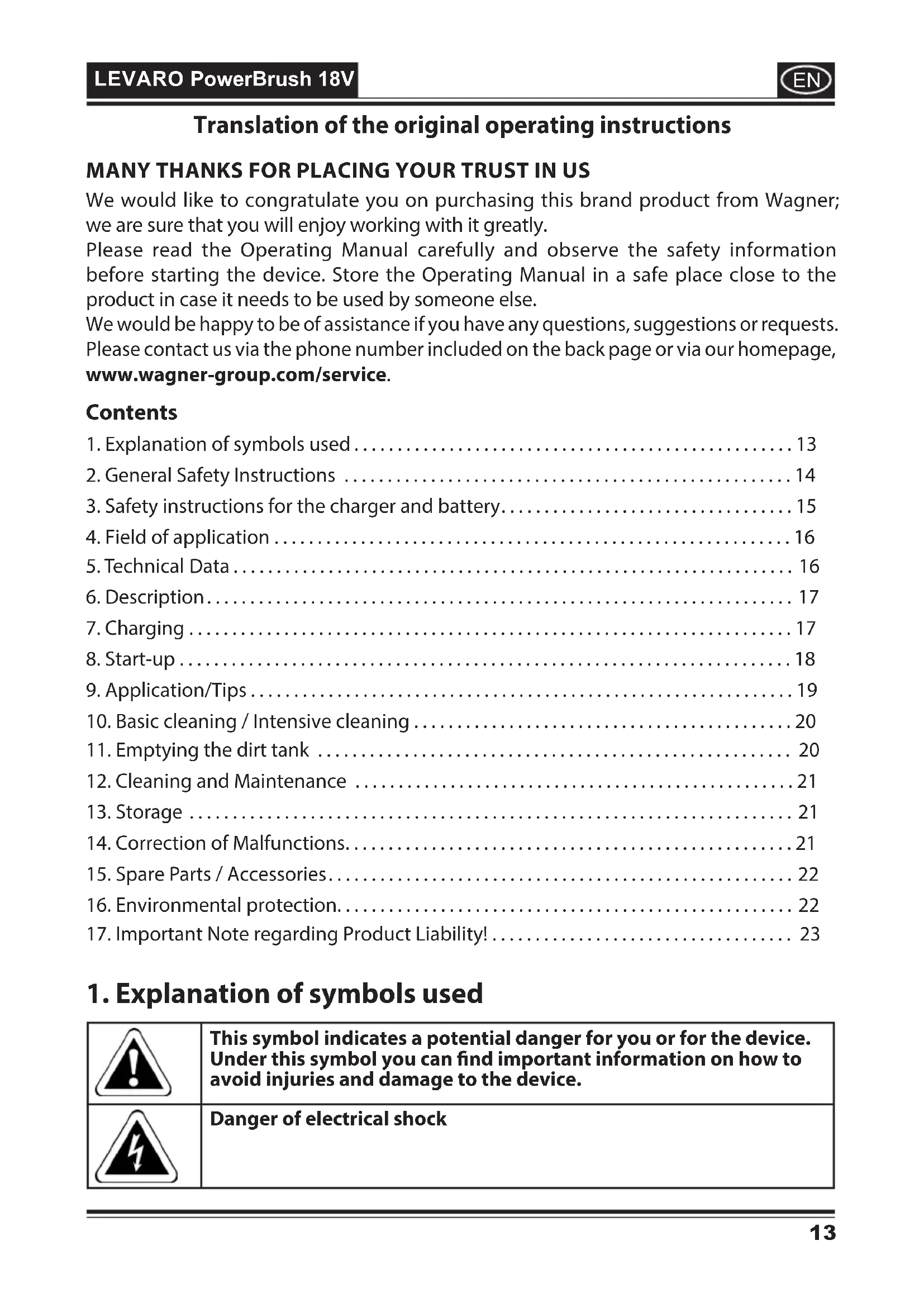 Download the instructions for your Vacuum Cleaner in PDF format for free! Find your manual Levaro Powerbrush 18V - WAGNER and take your electronic device back in hand. On this page are published all the documents necessary for the use of your device. Levaro Powerbrush 18V by WAGNER.