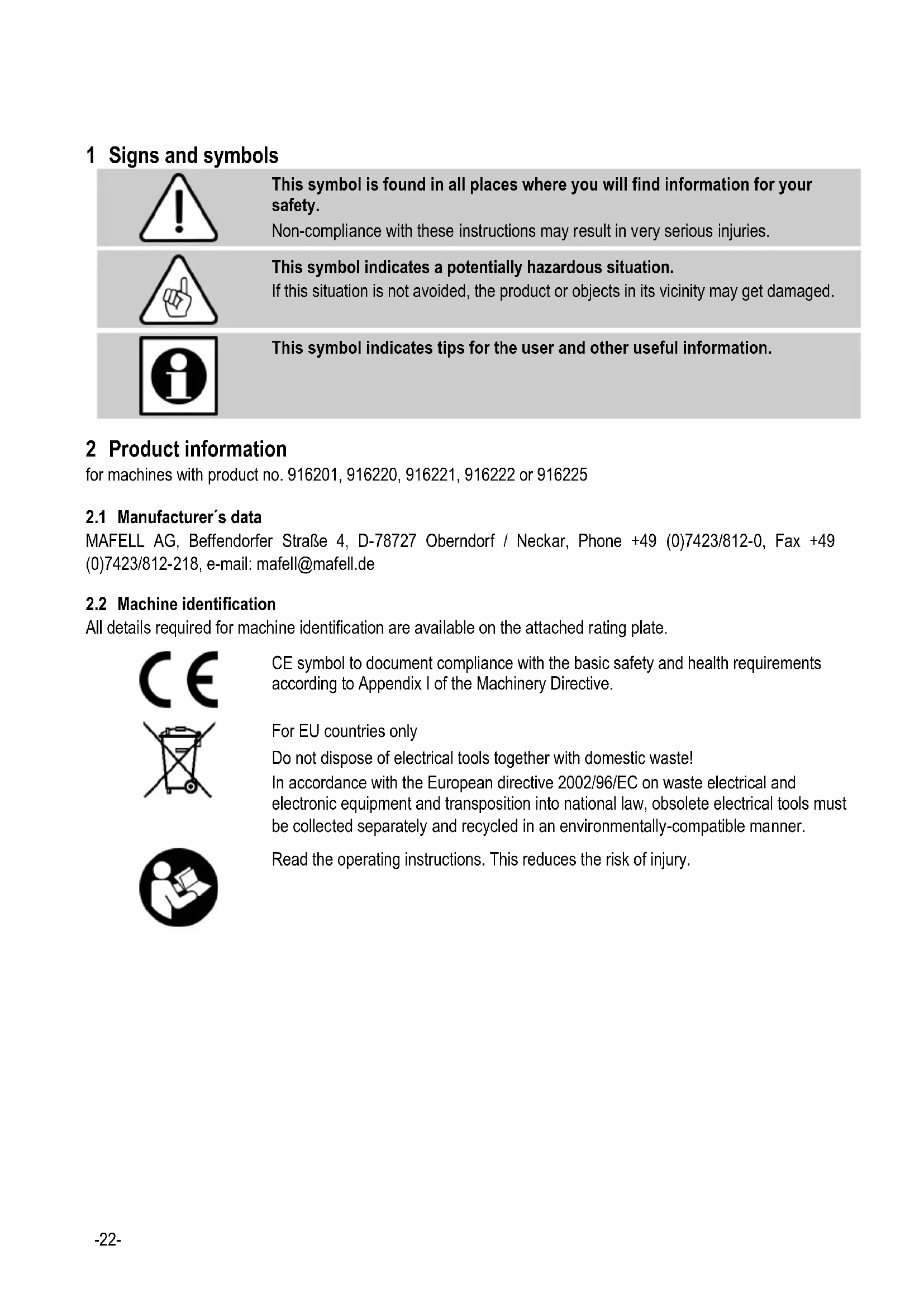 2 Product information for machines with product no. 916201, 916220, 916221, 916222 or 916225