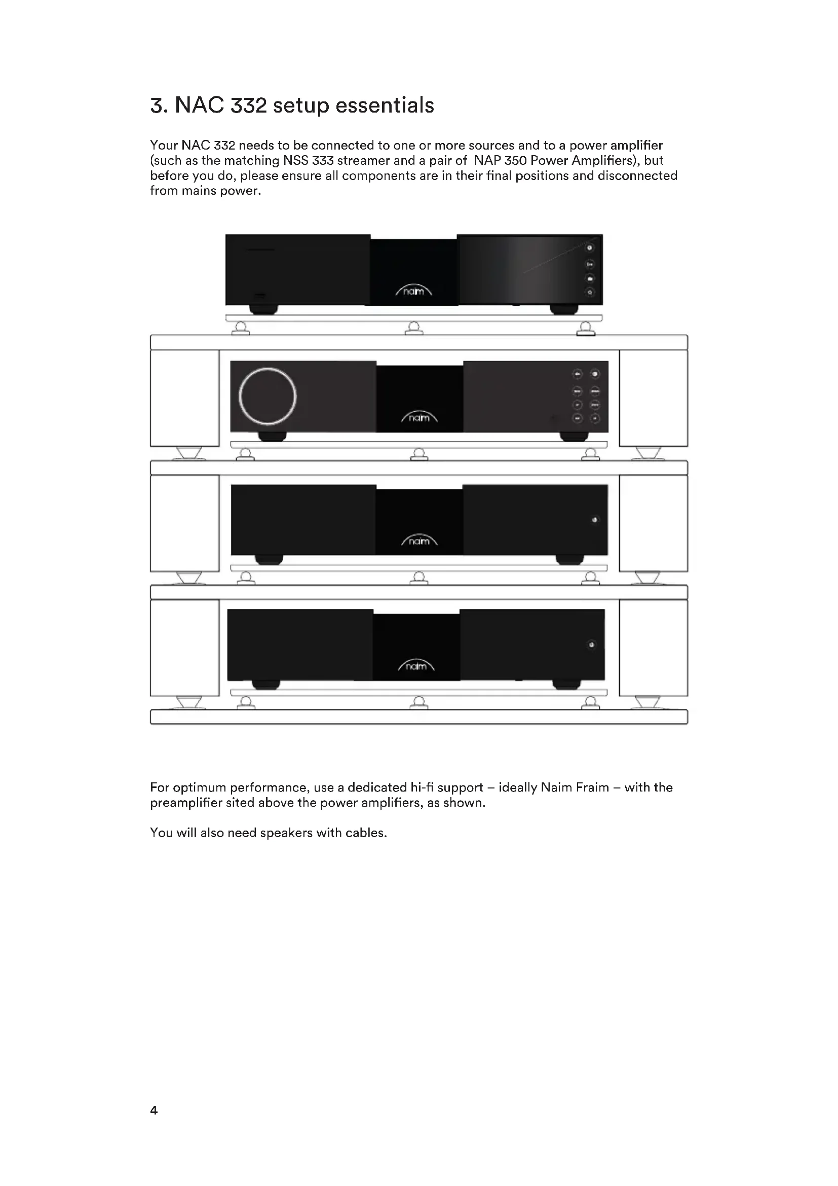 Your NAC 332 needs to be connected to one or more sources and to a power amplier (such as the matching NSS 333 streamer and a pair of NAP 350 Power Ampliers), but before you do, please ensure all components are in their nal positions and disconnected from mains power. For optimum performance, use a dedicated hi- support – ideally Naim Fraim – with the preamplier sited above the power ampliers, as shown. You will also need speakers with cables.55