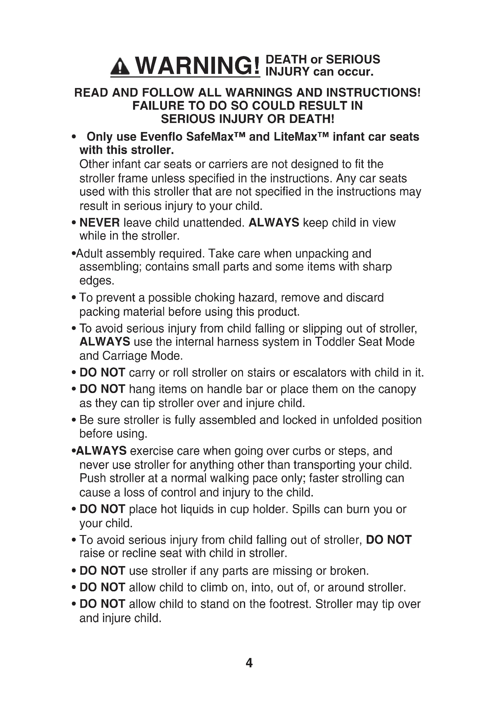 - If unable to securely attach the infant car seat to this stroller, remove the car seat and contact Evenflo ParentLink at 1-800-233-5921 (USA), 1-937-773-3971 (Canada), or 800-706-1200 (México). ENGLISH WARNING! DEATH or SERIOUS INJURY can occur.6 READ AND FOLLOW ALL WARNINGS AND INSTRUCTIONS! FAILURE TO DO SO COULD RESULT IN SERIOUS INJURY OR DEATH!