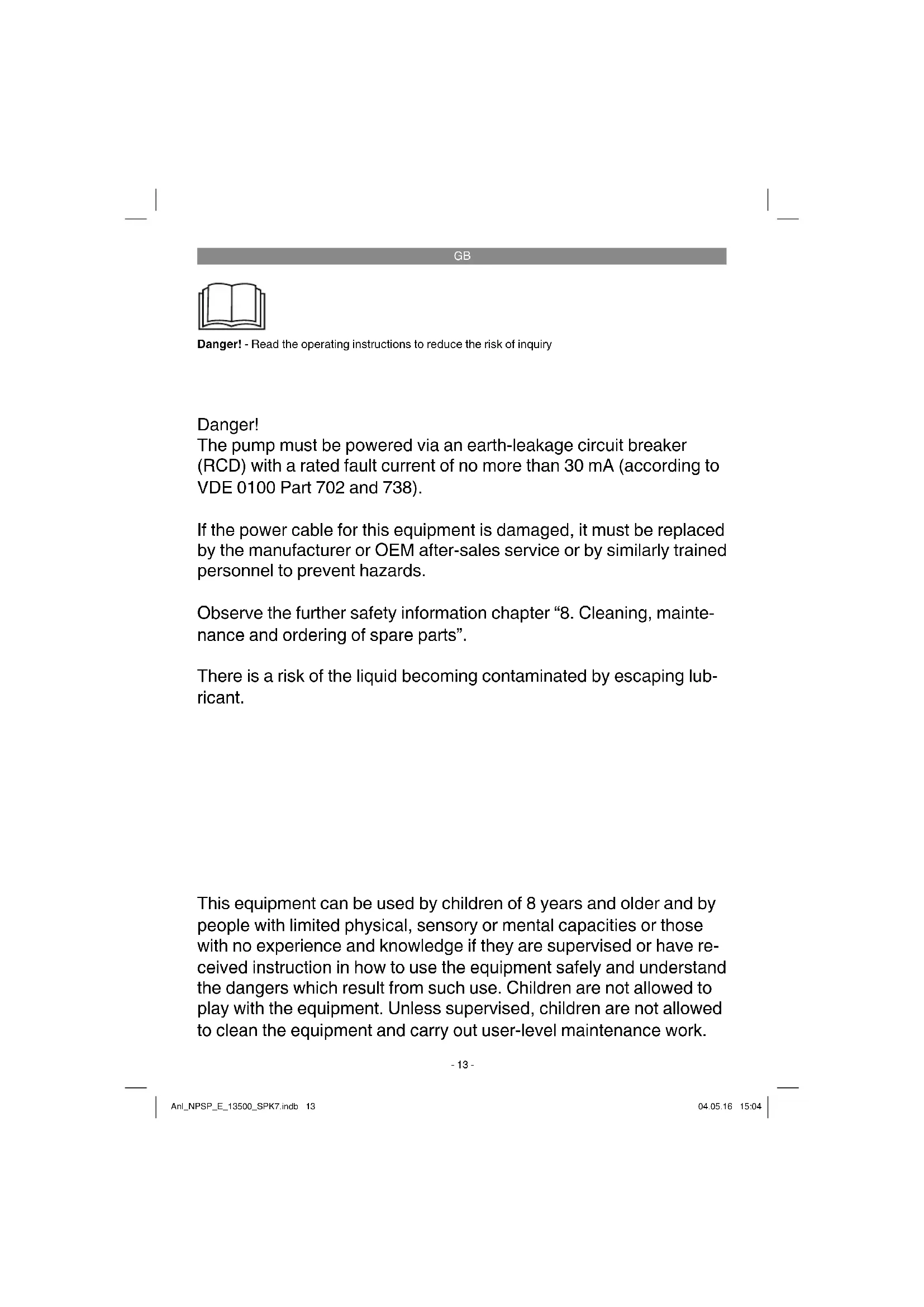 Danger! - Read the operating instructions to reduce the risk of inquiry This equipment can be used by children of 8 years and older and by people with limited physical, sensory or mental capacities or those with no experience and knowledge if they are supervised or have re- ceived instruction in how to use the equipment safely and understand the dangers which result from such use. Children are not allowed to play with the equipment. Unless supervised, children are not allowed to clean the equipment and carry out user-level maintenance work. Danger! The pump must be powered via an earth-leakage circuit breaker (RCD) with a rated fault current of no more than 30 mA (according to VDE 0100 Part 702 and 738). If the power cable for this equipment is damaged, it must be replaced by the manufacturer or OEM after-sales service or by similarly trained personnel to prevent hazards. Observe the further safety information chapter “8. Cleaning, mainte- nance and ordering of spare parts”. There is a risk of the liquid becoming contaminated by escaping lub- ricant. Anl_NPSP_E_13500_SPK7.indb 13Anl_NPSP_E_13500_SPK7.indb 13 04.05.16 15:0404.05.16 15:04GB