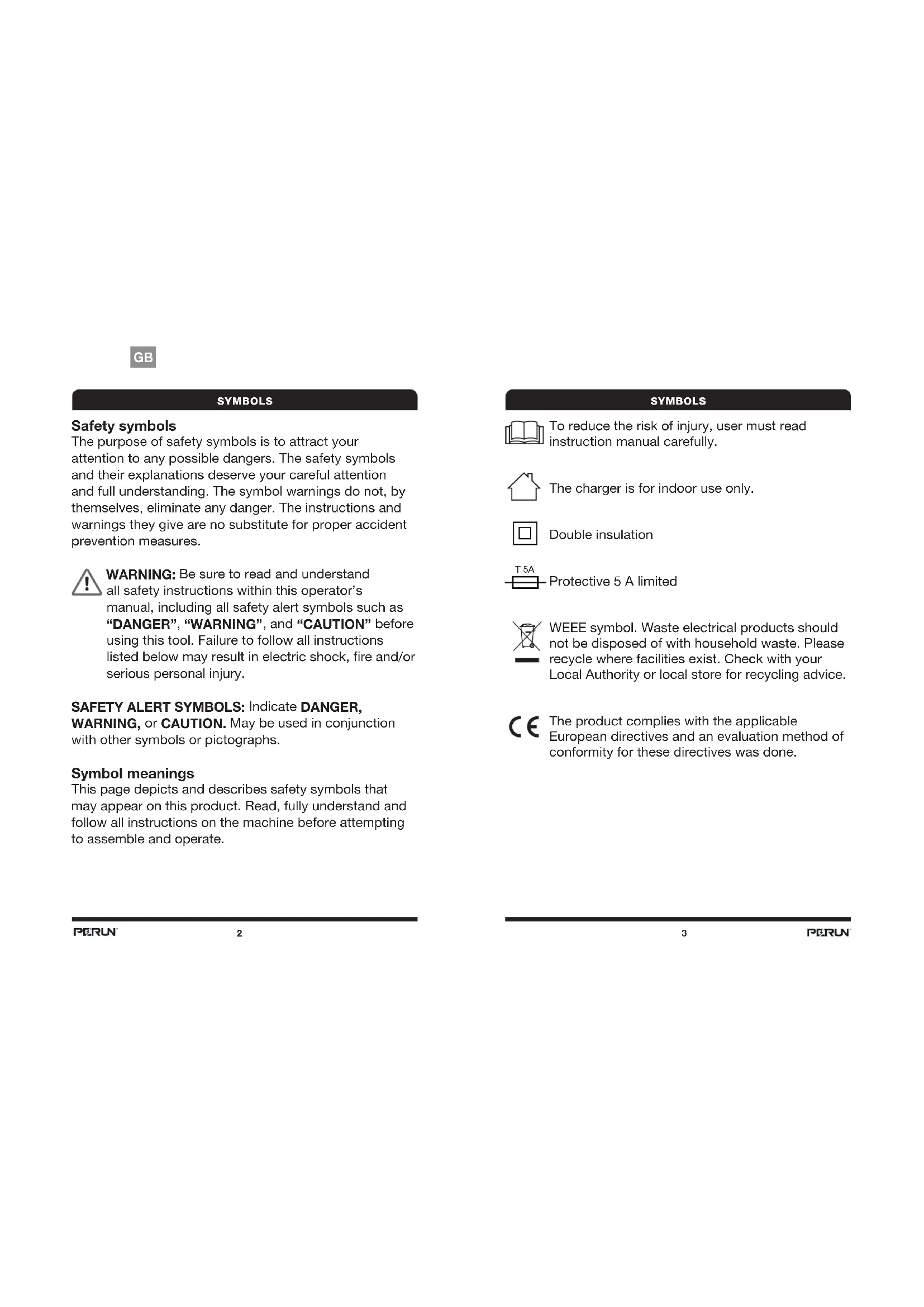 CAUTION. May be used in conjunction with other symbols or pictographs. Symbol meanings This page depicts and describes safety symbols that may appear on this product. Read, fully understand and follow all instructions on the machine before attempting to assemble and operate. SYMBOLS To reduce the risk of injury, user must read instruction manual carefully. The charger is for indoor use only. Double insulation Protective 5 A limited WEEE symbol. Waste electrical products should not be disposed of with household waste. Please recycle where facilities exist. Check with your Local Authority or local store for recycling advice. The product complies with the applicable European directives and an evaluation method of conformity for these directives was done. T 5A GB4 5