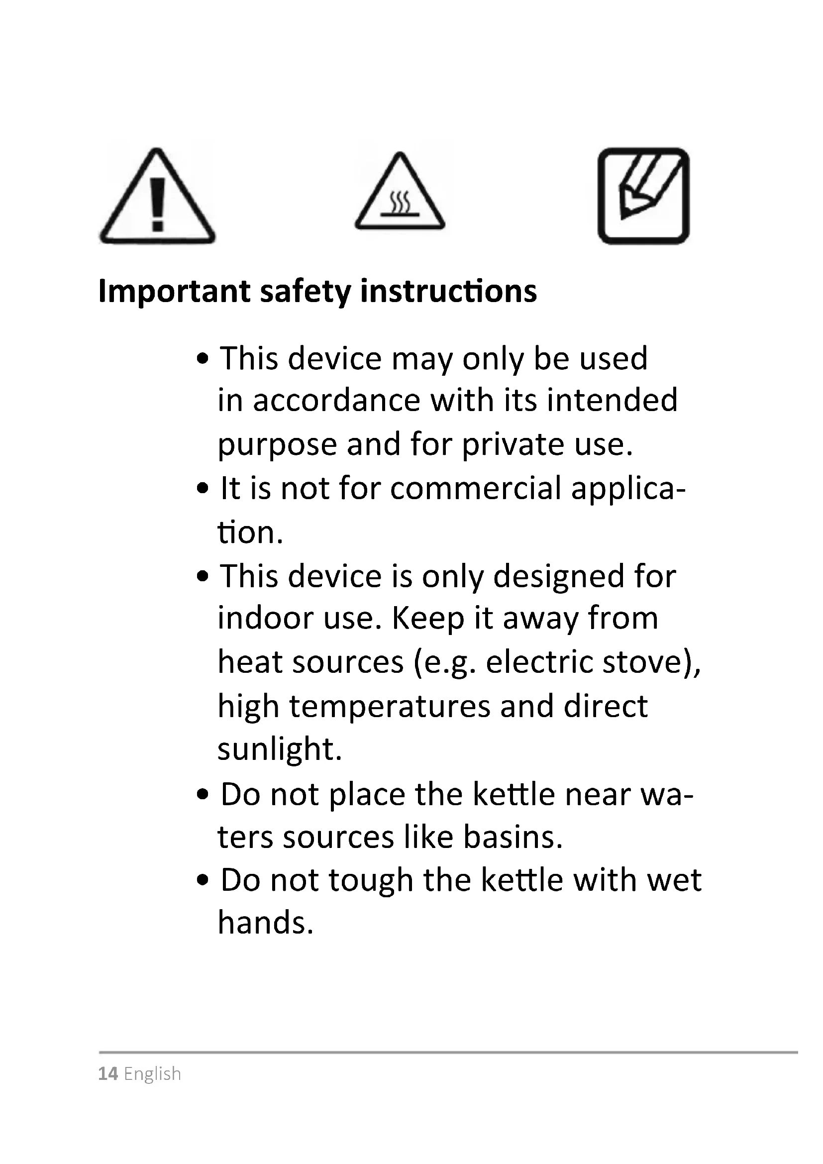 - This device is only designed for indoor use. Keep it away from heat sources (e.g. electric stove), high temperatures and direct sunlight.