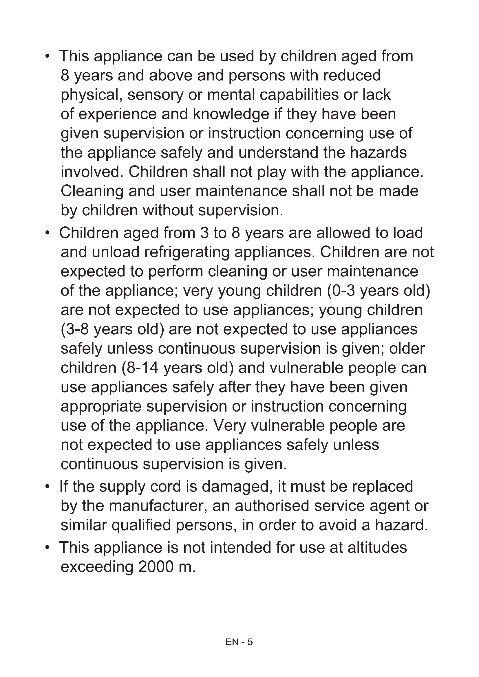 - Children aged from 3 to 8 years are allowed to load and unload refrigerating appliances. Children are not expected to perform cleaning or user maintenance of the appliance; very young children (0-3 years old) are not expected to use appliances; young children (3-8 years old) are not expected to use appliances safely unless continuous supervision is given; older children (8-14 years old) and vulnerable people can use appliances safely after they have been given appropriate supervision or instruction concerning use of the appliance. Very vulnerable people are not expected to use appliances safely unless continuous supervision is given.