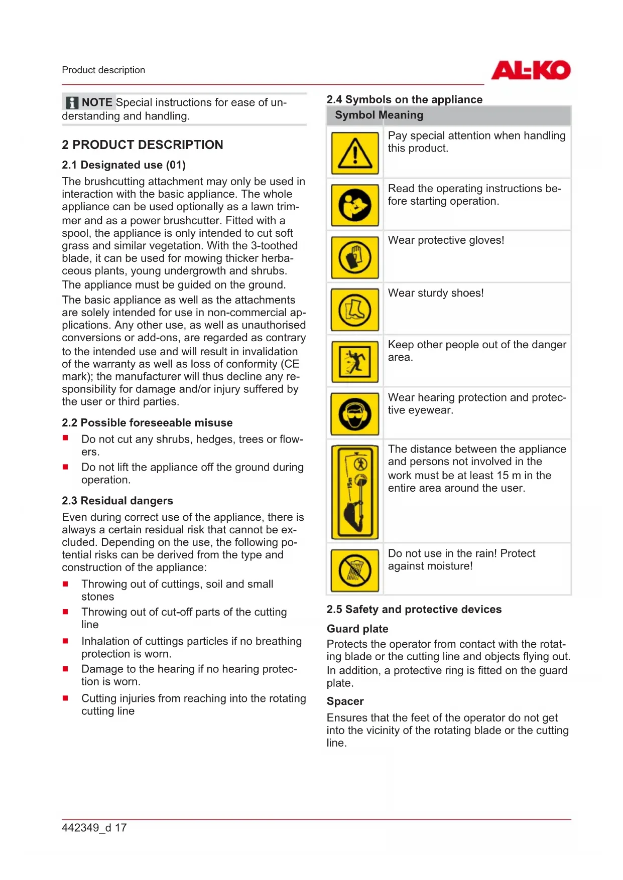 Symbol Meaning Pay special attention when handling this product. Read the operating instructions be- fore starting operation. Wear protective gloves! Wear sturdy shoes! Keep other people out of the danger area. Wear hearing protection and protec- tive eyewear. The distance between the appliance and persons not involved in the work must be at least 15m in the entire area around the user. Do not use in the rain! Protect against moisture!