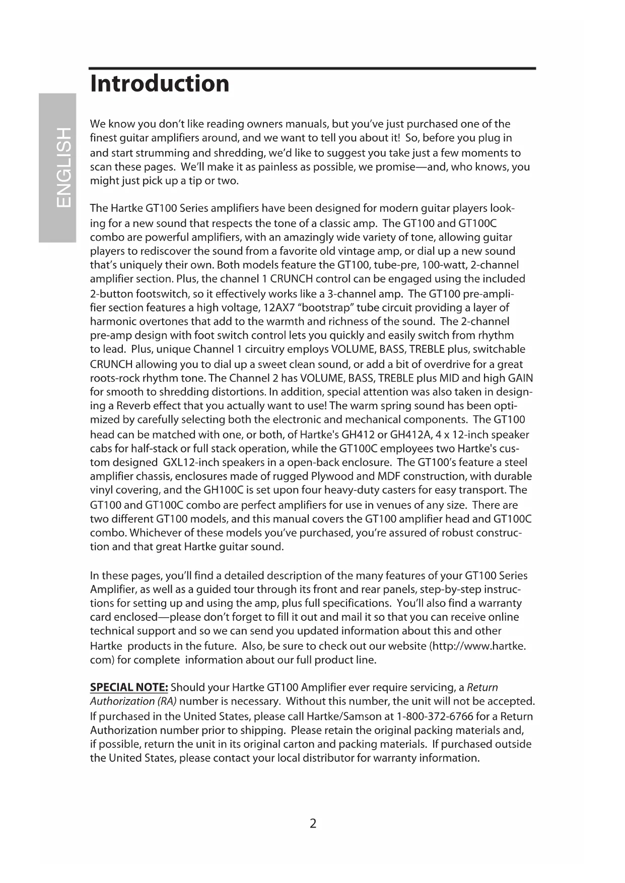 SPECIAL NOTE: Should your Hartke GT100 Amplifier ever require servicing, a Return Authorization (RA) number is necessary. Without this number, the unit will not be accepted. If purchased in the United States, please call Hartke/Samson at 1-800-372-6766 for a Return Authorization number prior to shipping. Please retain the original packing materials and, if possible, return the unit in its original carton and packing materials. If purchased outside the United States, please contact your local distributor for warranty information.