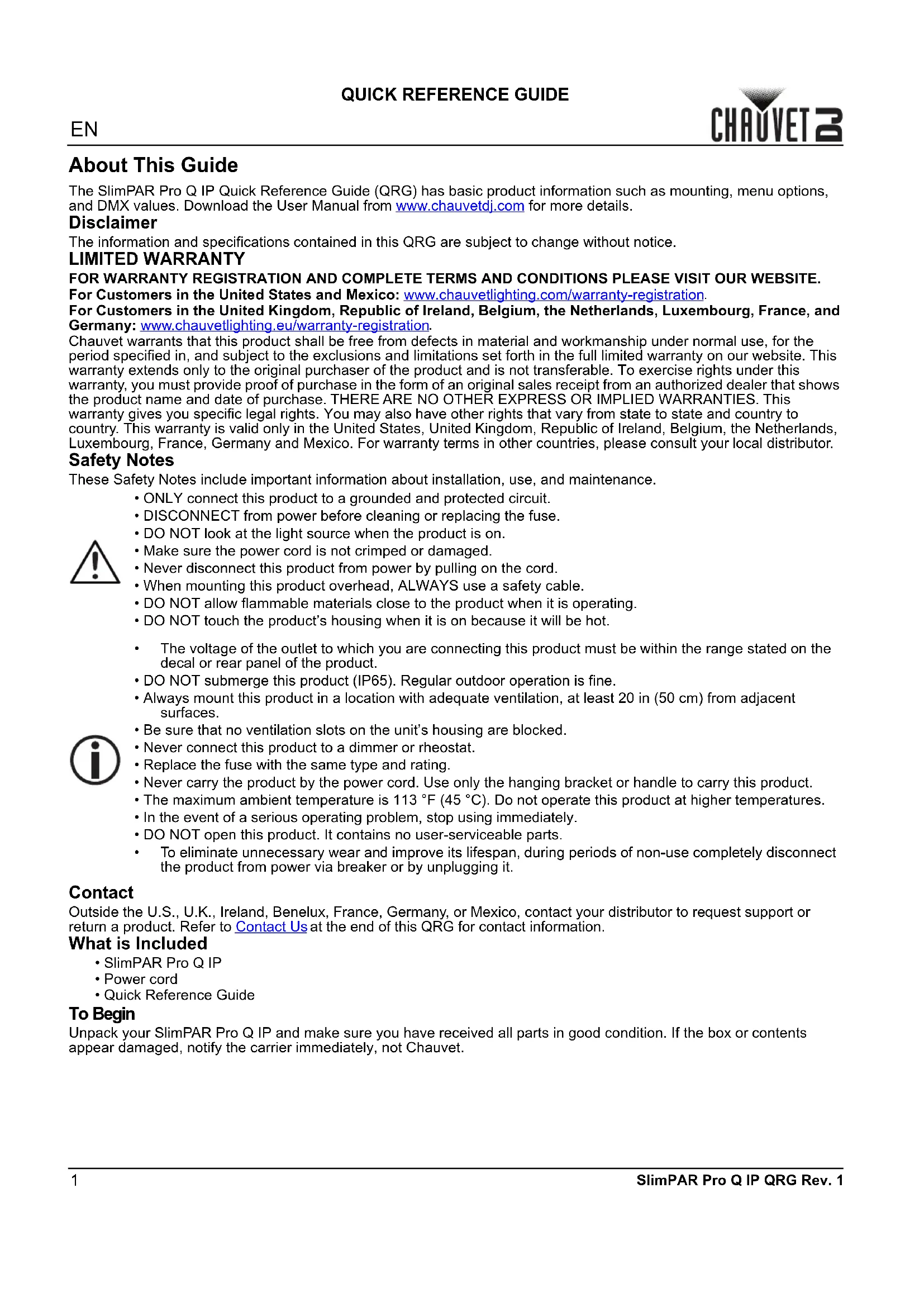 Chauvet warrants that this product shall be free from defects in material and workmanship under normal use, for the period specified in, and subject to the exclusions and limitations set forth in the full limited warranty on our website. This warranty extends only to the original purchaser of the product and is not transferable. To exercise rights under this warranty, you must provide proof of purchase in the form of an original sales receipt from an authorized dealer that shows the product name and date of purchase. THERE ARE NO OTHER EXPRESS OR IMPLIED WARRANTIES. This warranty gives you specific legal rights. You may also have other rights that vary from state to state and country to country. This warranty is valid only in the United States, United Kingdom, Republic of Ireland, Belgium, the Netherlands, Luxembourg, France, Germany and Mexico. For warranty terms in other countries, please consult your local distributor. Safety Notes These Safety Notes include important information about installation, use, and maintenance. Contact Outside the U.S., U.K., Ireland, Benelux, France, Germany, or Mexico, contact your distributor to request support or return a product. Refer to Contact Us at the end of this QRG for contact information. What is Included To Begin Unpack your SlimPAR Pro Q IP and make sure you have received all parts in good condition. If the box or contents appear damaged, notify the carrier immediately, not Chauvet.