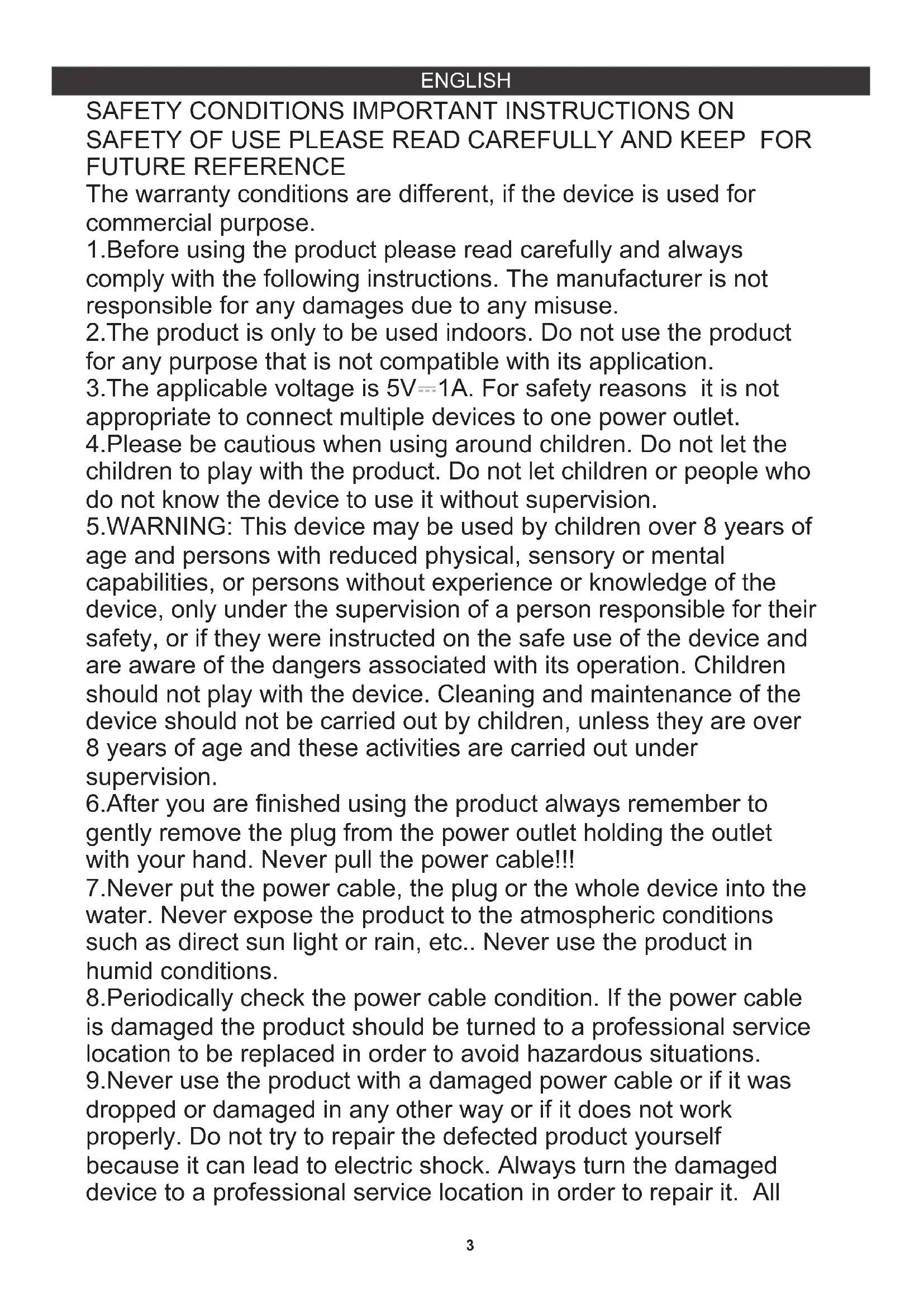 SAFETY OF USE PLEASE READ CAREFULLY AND KEEP FOR FUTURE REFERENCE The warranty conditions are different, if the device is used for commercial purpose. 1.Before using the product please read carefully and always comply with the following instructions. The manufacturer is not responsible for any damages due to any misuse. 2.The product is only to be used indoors. Do not use the product for any purpose that is not compatible with its application. 3.The applicable voltage is 5V 1A. For safety reasons it is not appropriate to connect multiple devices to one power outlet. 4.Please be cautious when using around children. Do not let the children to play with the product. Do not let children or people who do not know the device to use it without supervision. 5.WARNING: This device may be used by children over 8 years of age and persons with reduced physical, sensory or mental capabilities, or persons without experience or knowledge of the device, only under the supervision of a person responsible for their safety, or if they were instructed on the safe use of the device and are aware of the dangers associated with its operation. Children should not play with the device. Cleaning and maintenance of the device should not be carried out by children, unless they are over 8 years of age and these activities are carried out under supervision. 6.After you are finished using the product always remember to gently remove the plug from the power outlet holding the outlet with your hand. Never pull the power cable!!! 7.Never put the power cable, the plug or the whole device into the water. Never expose the product to the atmospheric conditions such as direct sun light or rain, etc.. Never use the product in humid conditions. 8.Periodically check the power cable condition. If the power cable is damaged the product should be turned to a professional service location to be replaced in order to avoid hazardous situations. 9.Never use the product with a damaged power cable or if it was dropped or damaged in any other way or if it does not work properly. Do not try to repair the defected product yourself because it can lead to electric shock. Always turn the damaged device to a professional service location in order to repair it. All4 12.Do not let cord hang over edge of counter or touch hot surfaces. the repairs can be done only by authorized service professionals. The repair that was done incorrectly can cause hazardous situations for the user. 10.Never put the product on or close to the hot or warm surfaces or the kitchen appliances like the electric oven or gas burner. 11.Never use the product close to combustibles.