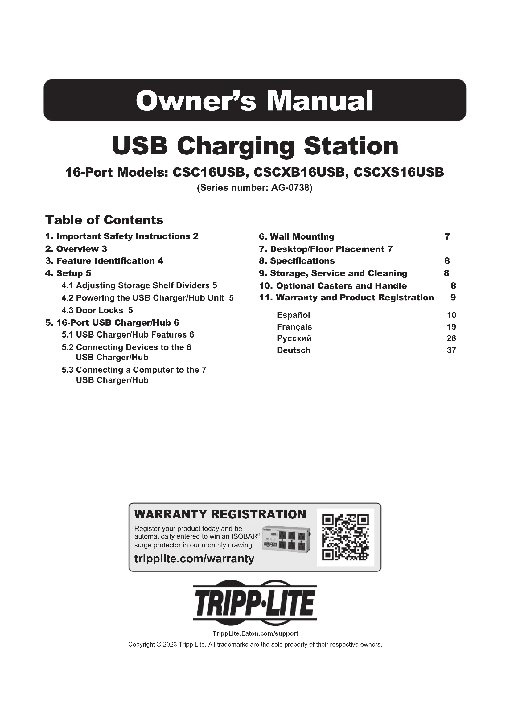 Français РусскийDeutsch 37 USB Charging Station 16-Port Models: CSC16USB, CSCXB16USB, CSCXS16USB (Seriesnumber:AG-0738) Owner’s Manual TrippLite.Eaton.com/supportCopyright © 2023 Tripp Lite. All trademarks are the sole property of their respective owners. WARRANTY REGISTRATION Register your product today and be automatically entered to win an ISOBAR