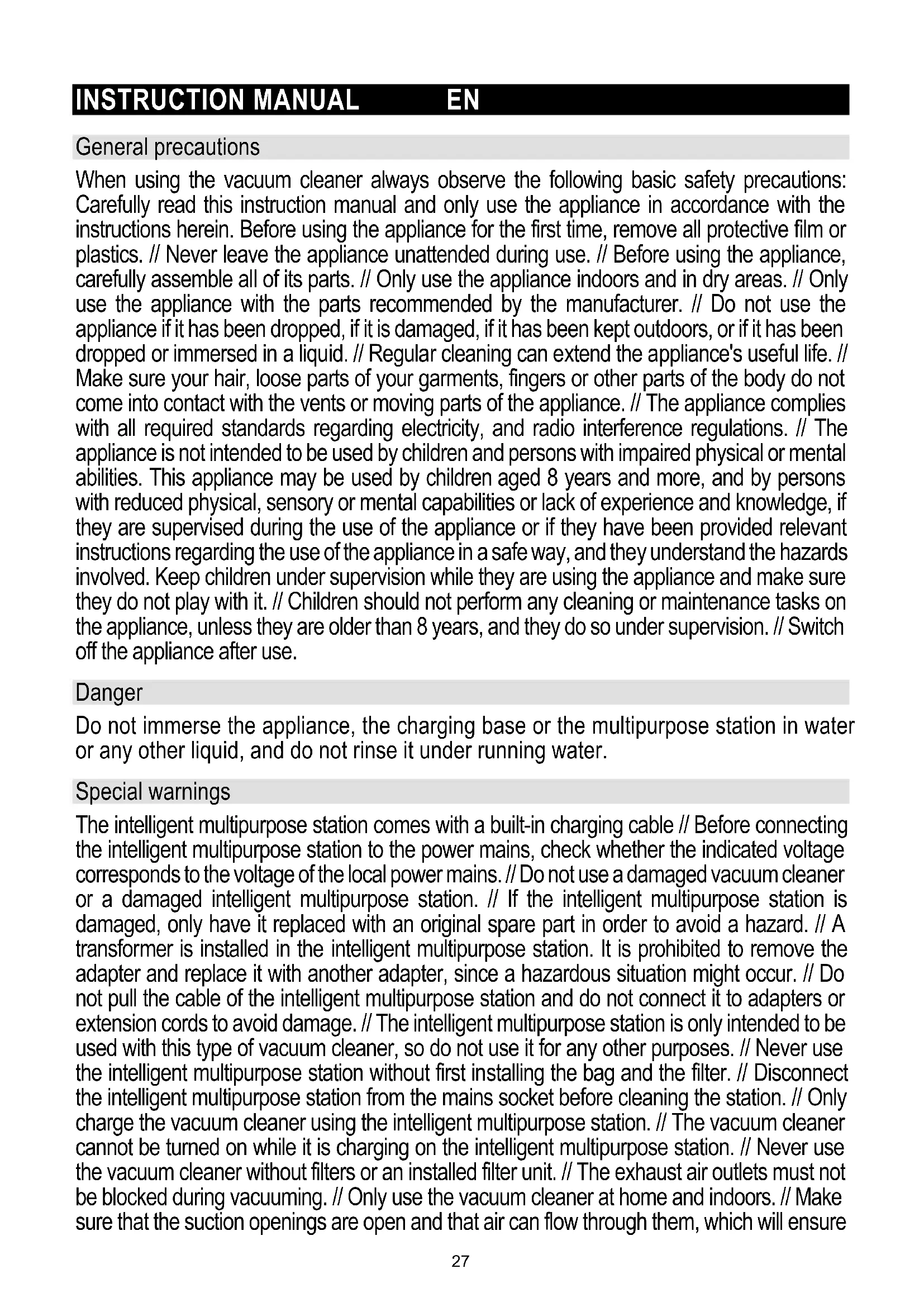 General precautions When using the vacuum cleaner always observe the following basic safety precautions: Carefully read this instruction manual and only use the appliance in accordance with the instructions herein. Before using the appliance for the first time, remove all protective film or plastics. // Never leave the appliance unattended during use. // Before using the appliance, carefully assemble all of its parts. // Only use the appliance indoors and in dry areas. // Only use the appliance with the parts recommended by the manufacturer. // Do not use the appliance if it has been dropped, if it is damaged, if it has been kept outdoors, or if it has been dropped or immersed in a liquid. // Regular cleaning can extend the appliance's useful life. // Make sure your hair, loose parts of your garments, fingers or other parts of the body do not come into contact with the vents or moving parts of the appliance. // The appliance complies with all required standards regarding electricity, and radio interference regulations. // The appliance is not intended to be used by children and persons with impaired physical or mental abilities. This appliance may be used by children aged 8 years and more, and by persons with reduced physical, sensory or mental capabilities or lack of experience and knowledge, if they are supervised during the use of the appliance or if they have been provided relevant instructions regarding the use of the appliance in a safe way, and they understand the hazards involved. Keep children under supervision while they are using the appliance and make sure they do not play with it. // Children should not perform any cleaning or maintenance tasks on the appliance, unless they are older than 8 years, and they do so under supervision. // Switch off the appliance after use. Danger Do not immerse the appliance, the charging base or the multipurpose station in water or any other liquid, and do not rinse it under running water. Special warnings The intelligent multipurpose station comes with a built-in charging cable // Before connecting the intelligent multipurpose station to the power mains, check whether the indicated voltage corresponds to the voltage of the local power mains. // Do not use a damaged vacuum cleaner or a damaged intelligent multipurpose station. // If the intelligent multipurpose station is damaged, only have it replaced with an original spare part in order to avoid a hazard. // A transformer is installed in the intelligent multipurpose station. It is prohibited to remove the adapter and replace it with another adapter, since a hazardous situation might occur. // Do not pull the cable of the intelligent multipurpose station and do not connect it to adapters or extension cords to avoid damage. // The intelligent multipurpose station is only intended to be used with this type of vacuum cleaner, so do not use it for any other purposes. // Never use the intelligent multipurpose station without first installing the bag and the filter. // Disconnect the intelligent multipurpose station from the mains socket before cleaning the station. // Only charge the vacuum cleaner using the intelligent multipurpose station. // The vacuum cleaner cannot be turned on while it is charging on the intelligent multipurpose station. // Never use the vacuum cleaner without filters or an installed filter unit. // The exhaust air outlets must not be blocked during vacuuming. // Only use the vacuum cleaner at home and indoors. // Make sure that the suction openings are open and that air can flow through them, which will ensure 27optimum and smooth suction power of the appliance. Regular cleaning of the open parts of the suction hose and removal of dust, hair, or anything else that could clog the air flow is highly recommended. // Never use the vacuum cleaner to clean burning particles or debris, cigarette butts, matches, liquids (e.g. water, carpet foam), or sharp, pointy objects (glass debris, etc.). // Never bring the suction hose or the open part of the appliance close to your face or to your body. // Never use the vacuum cleaner to vacuum construction materials (such as fine sand, lime, cement dust, toner dust, etc.). This may cause damage to the appliance. Problems and solution Problem Possible reason Solution Not working. The battery is dead. The handy VC is not assembled correctly. Charge. Assemble the handy VC correctly. Suction power has decreased. The dust cup is full. Block in filter. Block in the air inlet tunnel or on the roller of electrical brush. Pour out the dust. Clean or change filter. Clean the electrical brush. The VC is not charging. The charger is not connected on socket. The connector of charger is not connected to the hole of base body. The handy VC is not assembled to the body. Connect the charger on socket. Connect the charger with base body of VC. Assemble the handy VC on body. Use very short time after charging. Not enough charging time. The battery is aging. Charge according to instruction. Change the battery. Environment not throw away the appliance with the normal household waste at the end of its life. Hand it in at an official collection point for recycling. By doing this, you help to preserve the environment. This appliance is marked according to the European directive 2012/19/EU on Waste Electrical and Electronic Equipment (WEEE). This guideline is the frame of a European-wide validity of return and recycling on Waste Electrical and Electronic Equipment. Guarantee & service If you need information or if you have a problem, please contact the Hisense Customer Care Centre in your country (the phone number is in the worldwide guarantee leaflet). If there is no Customer Care Centre in your country, go to your local Hisense dealer or contact the Service department of Hisense domestic appliances. Note: The warranty on the battery of vacuum cleaner is 12 months. For personal use only!