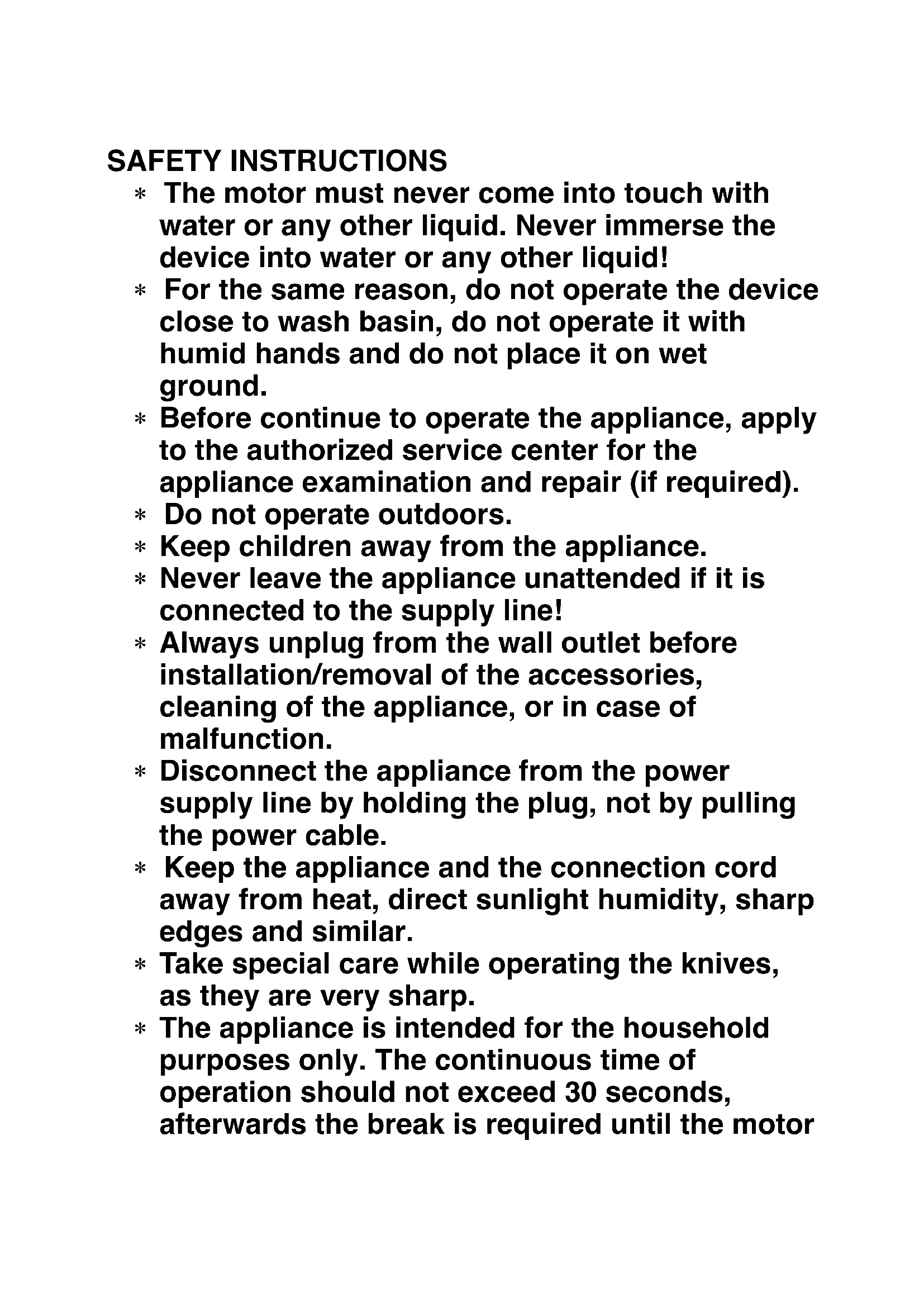 - The appliance is intended for the household purposes only. The continuous time of operation should not exceed 30 seconds, afterwards the break is required until the motoris cooled down completely.