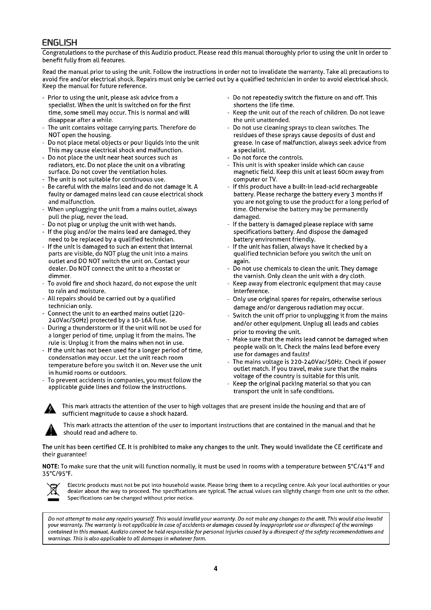 - If the unit is damaged to such an extent that internal parts are visible, do NOT plug the unit into a mains outlet and DO NOT switch the unit on. Contact your dealer. Do NOT connect the unit to a rheostat or dimmer.