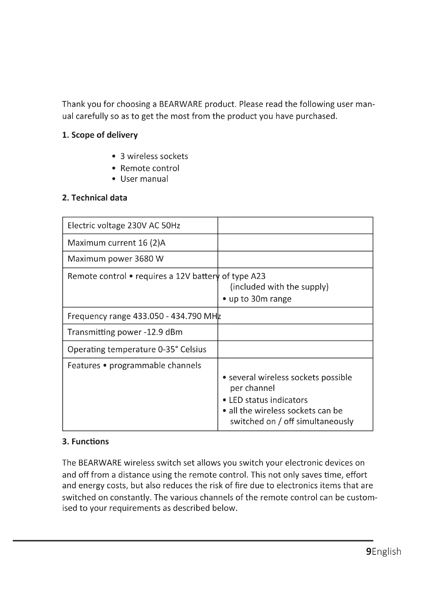 The BEARWARE wireless switch set allows you switch your electronic devices on and o from a distance using the remote control. This not only saves me, eort and energy costs, but also reduces the risk of re due to electronics items that are switched on constantly. The various channels of the remote control can be custom- ised to your requirements as described below. Electric voltage 230V AC 50Hz Maximum current 16 (2)A Maximum power 3680 W Remote control • requires a 12V baery of type A23 (included with the supply)