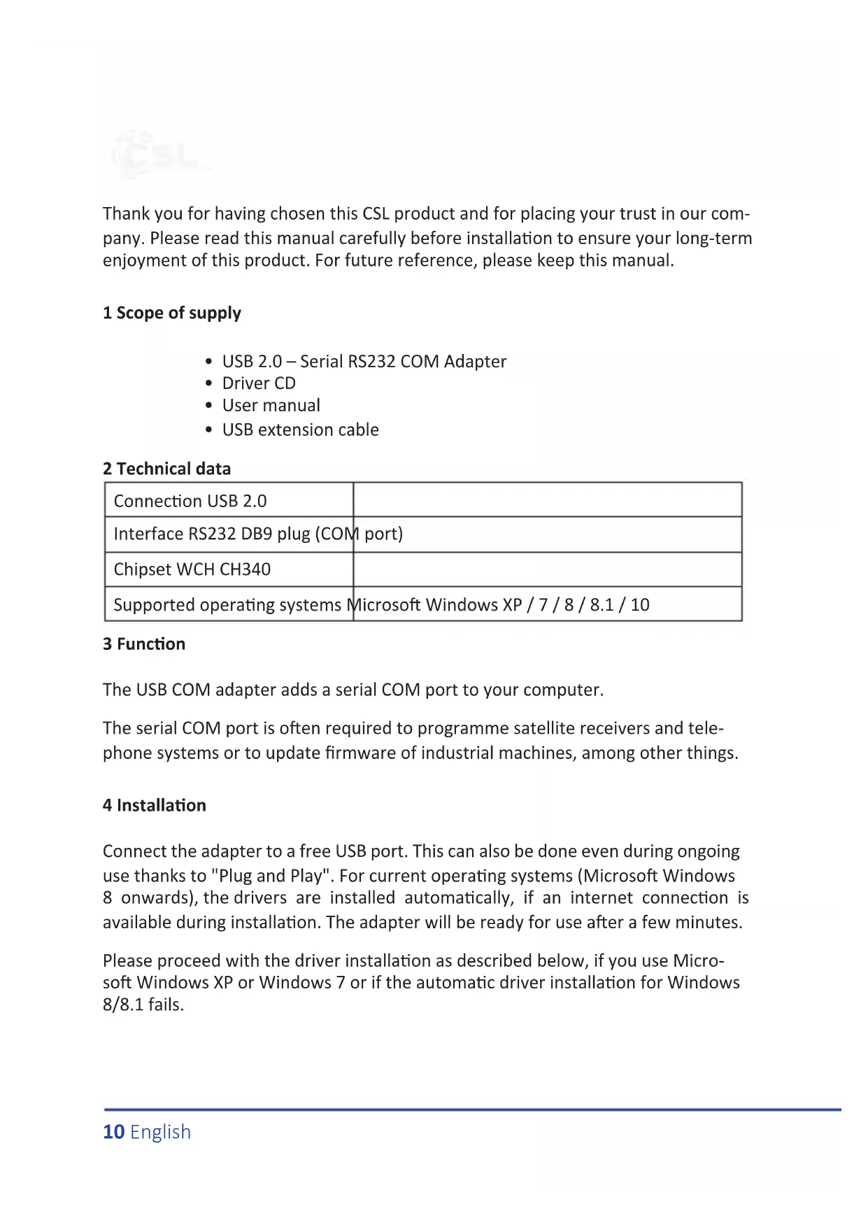 - USB extension cable 2 Technical data 3 Funcon The USB COM adapter adds a serial COM port to your computer. The serial COM port is oen required to programme satellite receivers and tele- phone systems or to update rmware of industrial machines, among other things. 4 Installaon Connect the adapter to a free USB port. This can also be done even during ongoing use thanks to "Plug and Play". For current operang systems (Microso Windows 8 onwards), the drivers are installed automacally, if an internet connecon is available during installaon. The adapter will be ready for use aer a few minutes. Please proceed with the driver installaon as described below, if you use Micro- so Windows XP or Windows 7 or if the automac driver installaon for Windows 8/8.1 fails. Connecon USB 2.0 Interface RS232 DB9 plug (COM port) Chipset WCH CH340 Supported operang systems Microso Windows XP / 7 / 8 / 8.1 / 1011English 5 Driver Installaon Connect the device to a free USB port and insert the accompanying driver CD into your computer's drive. Access the CD content via "My Computer" (Windows Vista onwards: "Computer"). Open the folder "340" on the driver CD and start the "SETUP" applicaon by dou- ble-clicking on it. A prompt for conrmaon is displayed, which you have to conrm with "Yes" to start the installaon program. Aer clicking "INSTALL", the driver installaon will begin. Please wait unl the installaon is completed. This may take several minutes. Aer the installaon is completed, a conrmaon message is displayed.12 English Click "OK" to close it. Close the installaon programme the same way. The drivers have been fully installed and the device is ready for immediate use. Note: If the installaon is not successful, please visit www.csl-computer.com for the latest driver version for your product. To go to the download area directly, enter the following address in your web browser: hps://p.csl-computer.com/pub/drivers/usb-adapter/20015-USB_zu_RS232_ Adapter_CH340_CH341/ Alternavely, there is also the opon to perform the installaon manually. Please follow the instrucons in Secon 5.1 of this Guide.