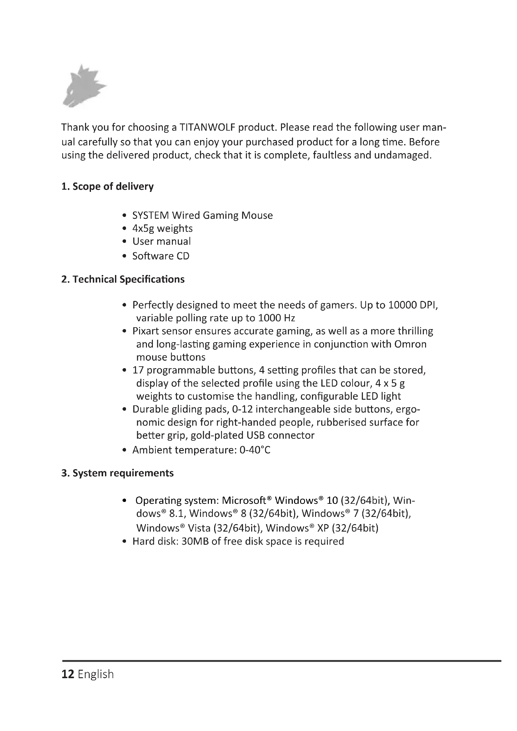 Thank you for choosing a TITANWOLF product. Please read the following user manual carefully so that you can enjoy your purchased product for a long time. Before using the delivered product, check that it is complete, faultless and undamaged.