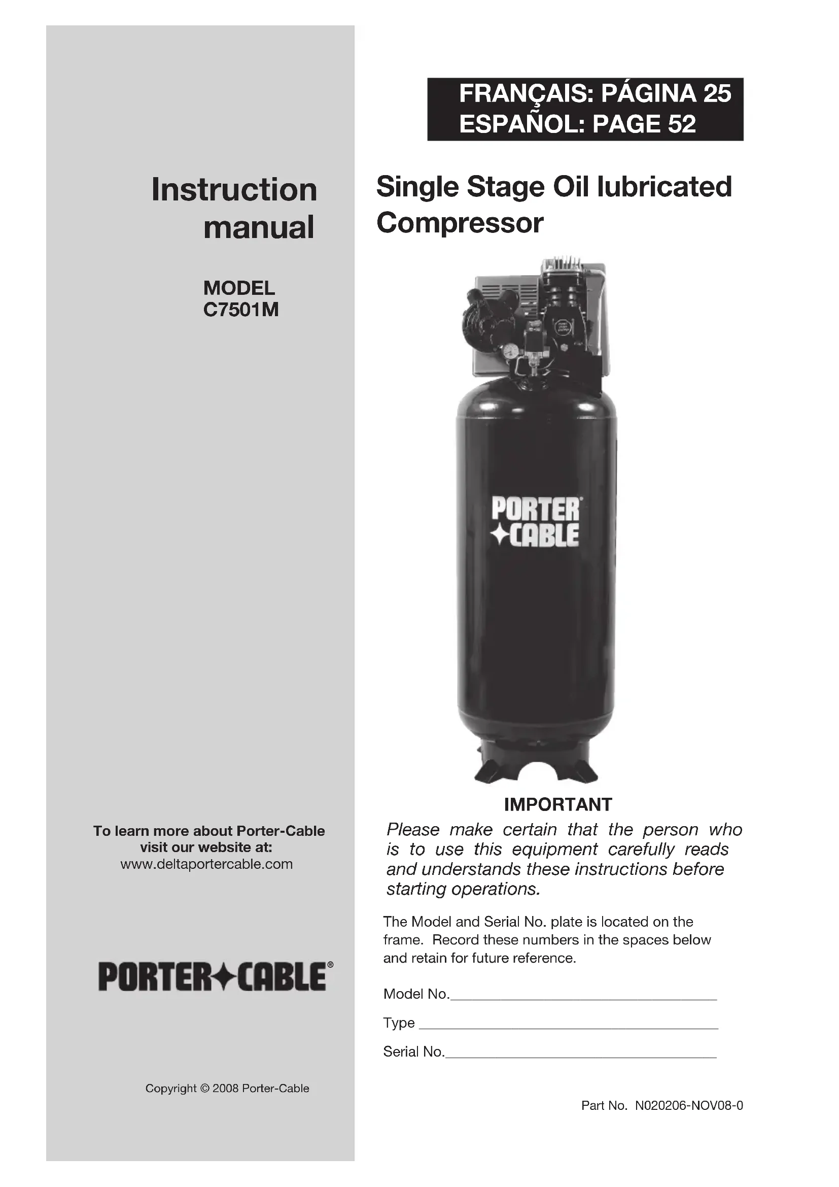 Part No. N020206-NOV08-0 Single Stage Oil lubricated Compressor Instruction manual To learn more about Porter-Cable visit our website at:www.deltaportercable.comThe Model and Serial No. plate is located on the frame. Record these numbers in the spaces below and retain for future reference.Model No._____________________________________ Type __________________________________________Serial No.______________________________________
