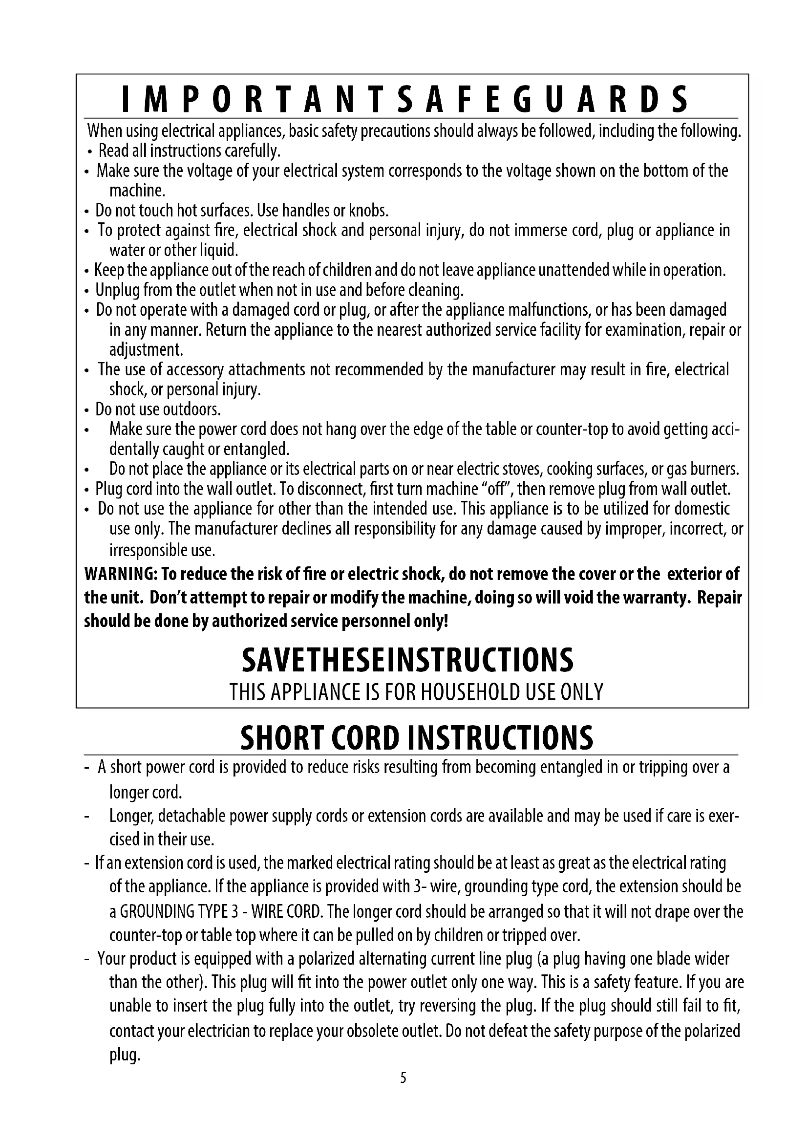- A short power cord is provided to reduce risks resulting from becoming entangled in or tripping over a longer cord. - Longer, detachable power supply cords or extension cords are available and may be used if care is exer- cised in their use. - If an extension cord is used, the marked electrical rating should be at least as great as the electrical rating of the appliance. If the appliance is provided with 3- wire, grounding type cord, the extension should be a GROUNDING TYPE 3 - WIRE CORD. The longer cord should be arranged so that it will not drape over the counter-top or table top where it can be pulled on by children or tripped over. - Your product is equipped with a polarized alternating current line plug (a plug having one blade wider than the other). This plug will t into the power outlet only one way. This is a safety feature. If you are unable to insert the plug fully into the outlet, try reversing the plug. If the plug should still fail to t, contact your electrician to replace your obsolete outlet. Do not defeat the safety purpose of the polarized plug.6