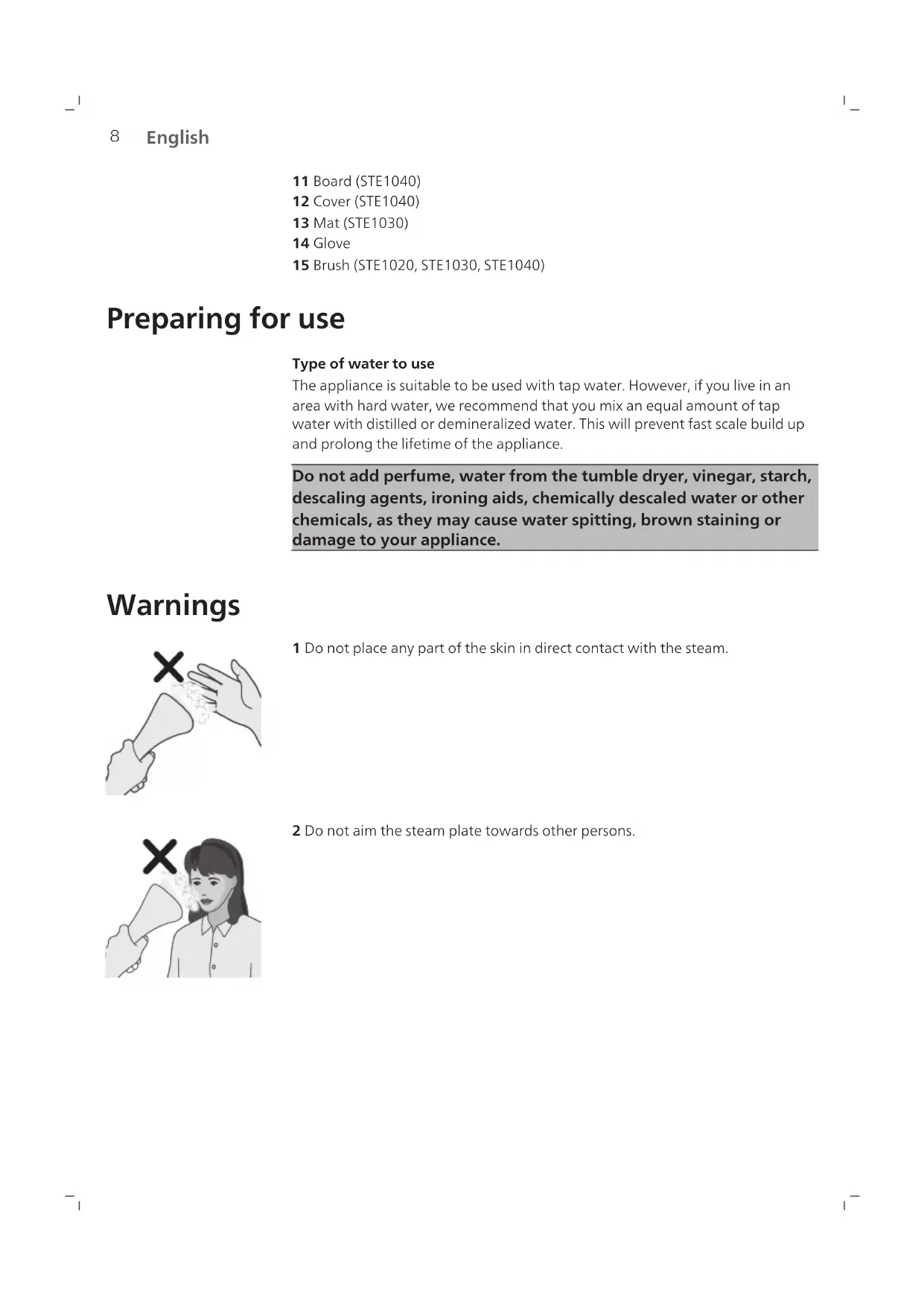 1 Steamer head 2 Steam supply hose 3 Steamer dock 4 Hanger (STE1011, STE1020, STE1030, STE1040) 5 Pole lock clip 6 Pole 7 Steam dial 8 Base 9 De-calc knob 10 Water tank8 English 11 Board (STE1040) 12 Cover (STE1040) 13 Mat (STE1030) 14 Glove 15 Brush (STE1020, STE1030, STE1040) Preparing for use Type of water to use The appliance is suitable to be used with tap water. However, if you live in an area with hard water, we recommend that you mix an equal amount of tap water with distilled or demineralized water. This will prevent fast scale build up and prolong the lifetime of the appliance. Do not add perfume, water from the tumble dryer, vinegar, starch, descaling agents, ironing aids, chemically descaled water or other chemicals, as they may cause water spitting, brown staining or damage to your appliance. Warnings 1 Do not place any part of the skin in direct contact with the steam. 2 Do not aim the steam plate towards other persons.9 English 3 Do not hold your garment in a way which is in direct contact with the steam. 4 Do not use the steamer head in a downwards direction. 5 Do not bend the hose to steam the garment. > 5 min. 6 Do not leave the stand steamer unattended for more than 5 minutes.10 English