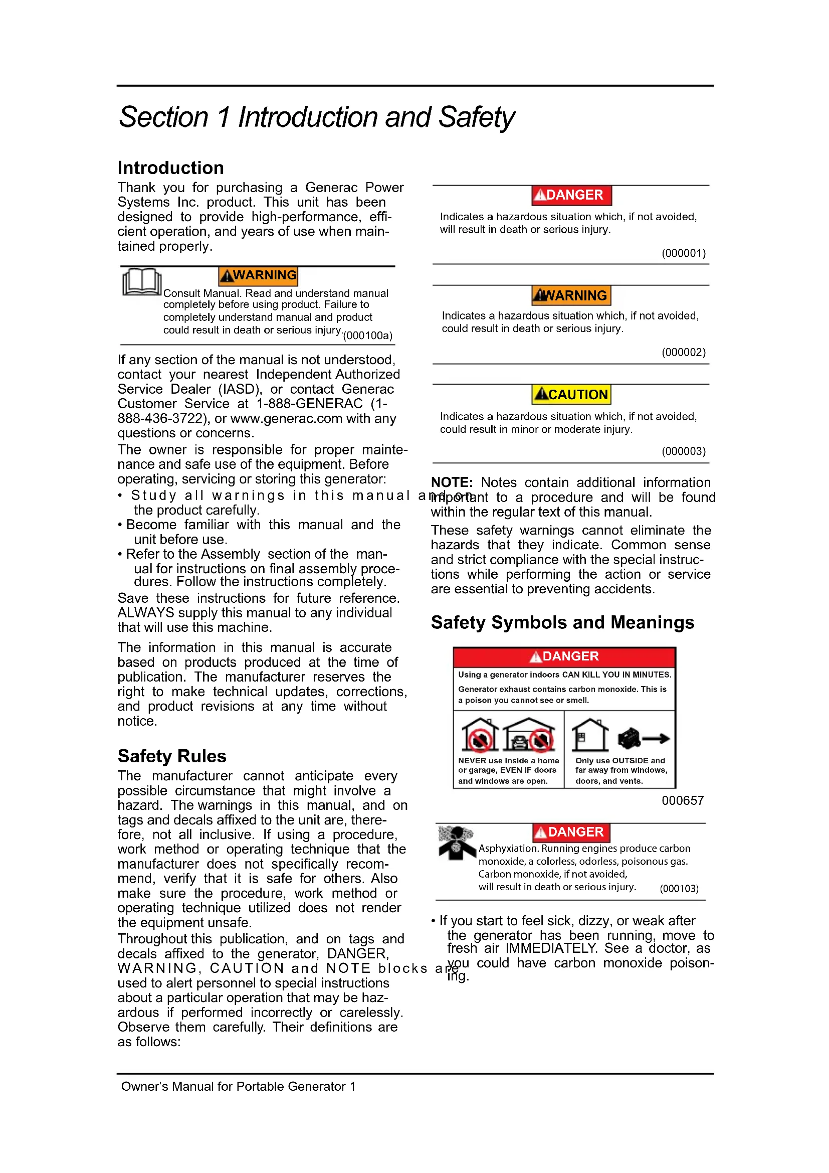 If any section of the manual is not understood, contact your nearest Independent Authorized Service Dealer (IASD), or contact Generac Customer Service at 1-888-GENERAC (1-888-436-3722), or wwwgenerac.com with any questions or concerns.