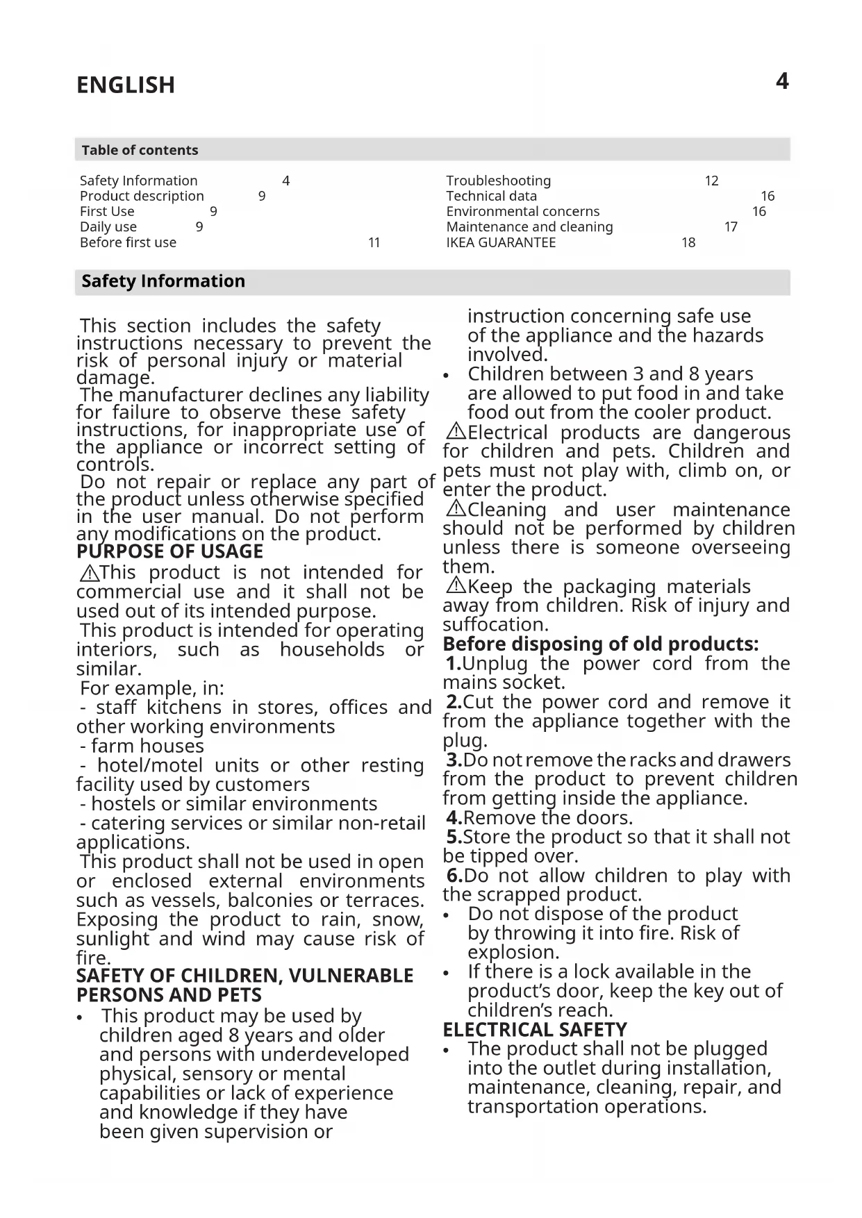 Safety Information 4 Product description 9 First Use 9 Daily use 9 Before first use 11 Table of contents Troubleshooting 12 Technical data 16 Environmental concerns 16 Maintenance and cleaning 17 IKEA GUARANTEE 18 Safety Information This section includes the safety instructions necessary to prevent the risk of personal injury or material damage. The manufacturer declines any liability for failure to observe these safety instructions, for inappropriate use of the appliance or incorrect setting of controls. Do not repair or replace any part of the product unless otherwise specified in the user manual. Do not perform any modifications on the product.